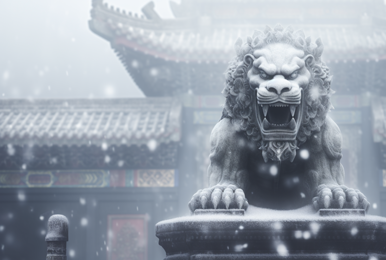 Majestic stone lion statue in snow, in front of a traditional Asian temple, creating a serene and mystical atmosphere.