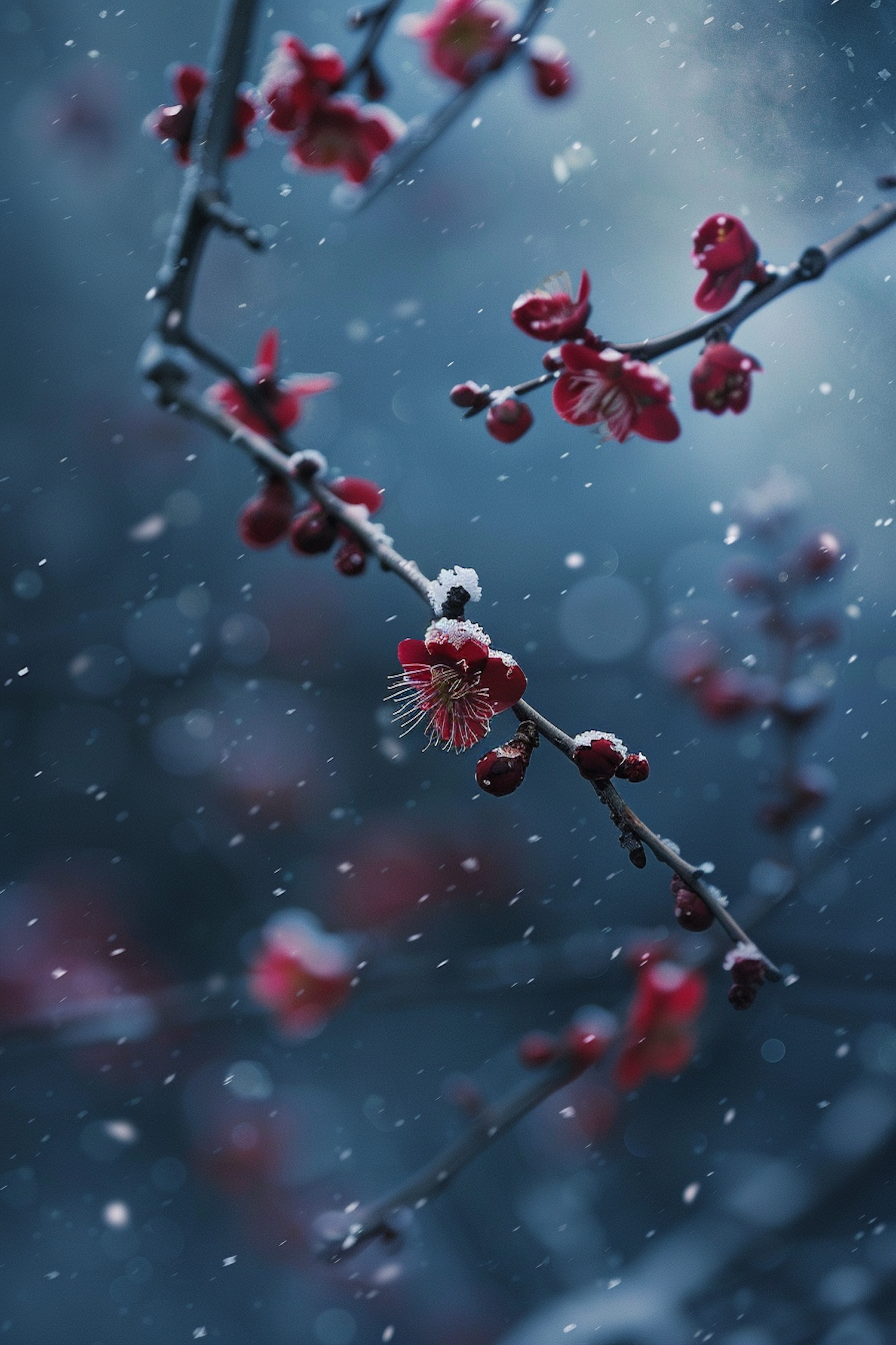 Red blossoms dusted with snow on branches, set against a cool blue background with falling snowflakes. A serene winter scene.