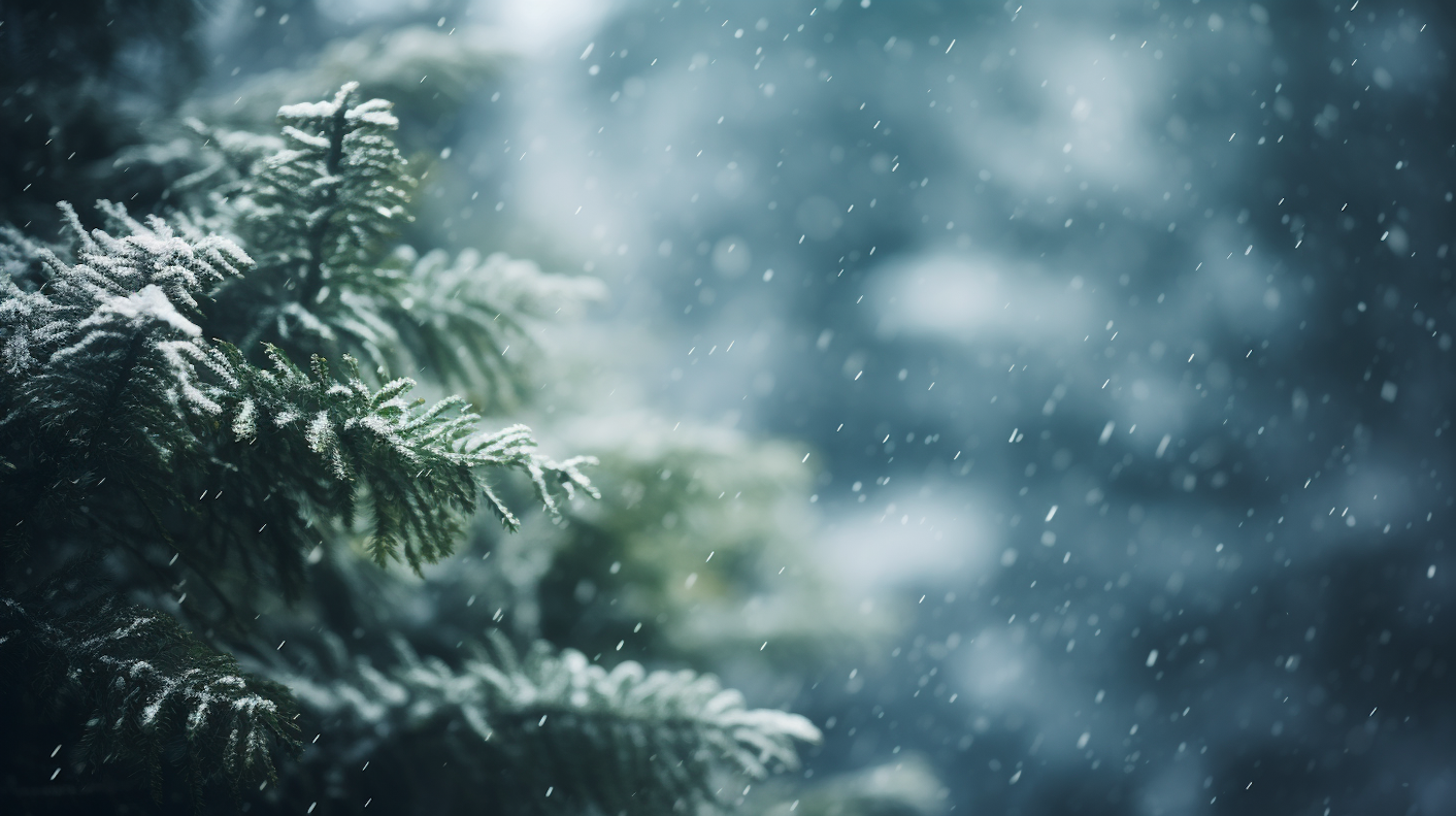 Snow-covered pine branches with falling snowflakes create a serene winter scene, highlighting the beauty of nature's tranquility.