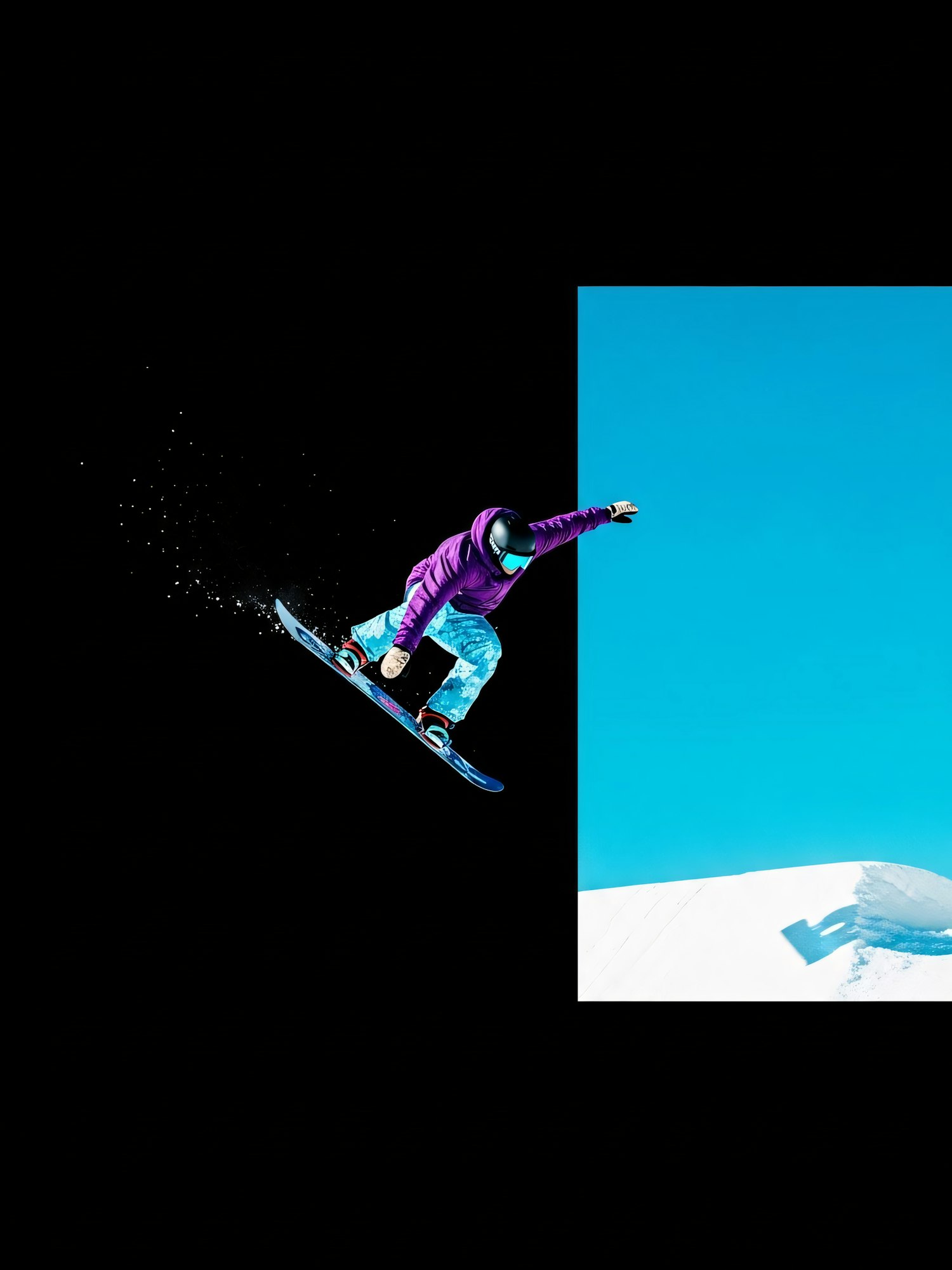 A snowboarder in vibrant gear performs a jump against a striking black and blue background, showcasing dynamic motion and skill.