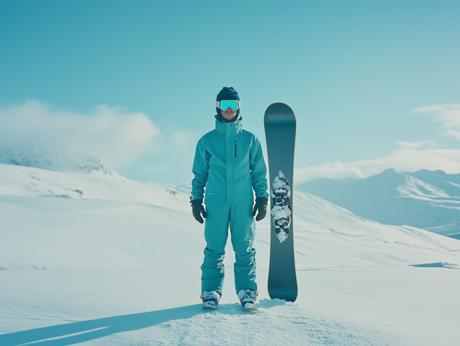 Snowboarder in teal gear stands on a snowy mountain, holding a board. Clear blue sky and distant peaks create a serene winter scene.