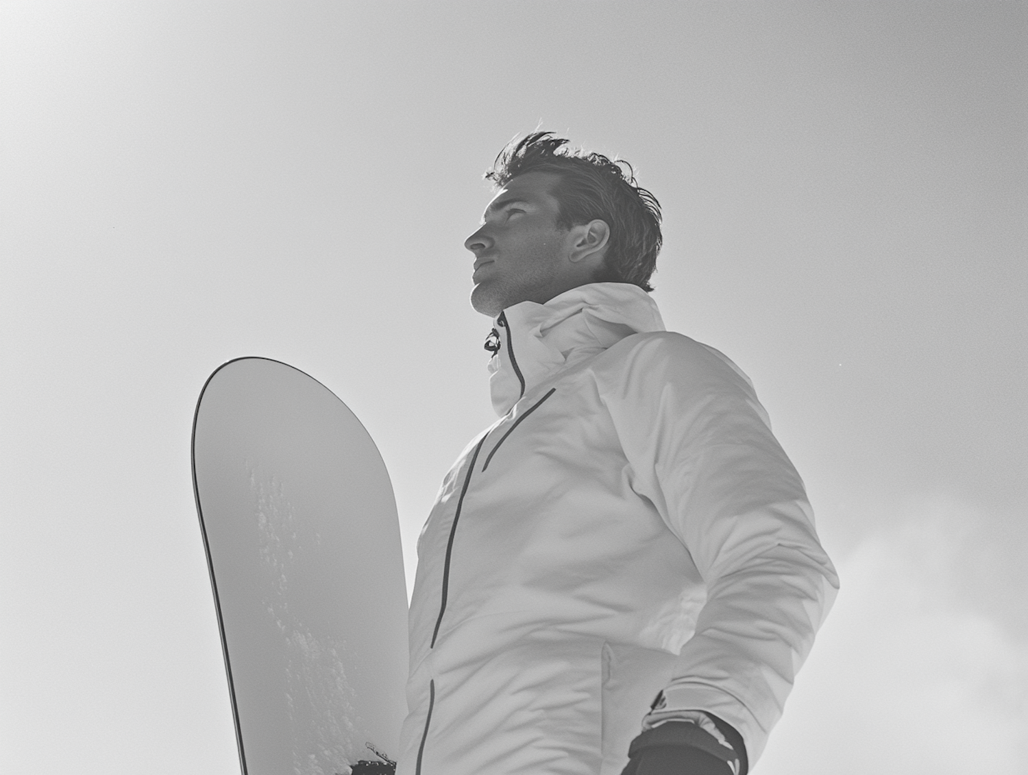 Black and white photo of a man in a white jacket holding a snowboard, gazing into the distance against a clear sky.