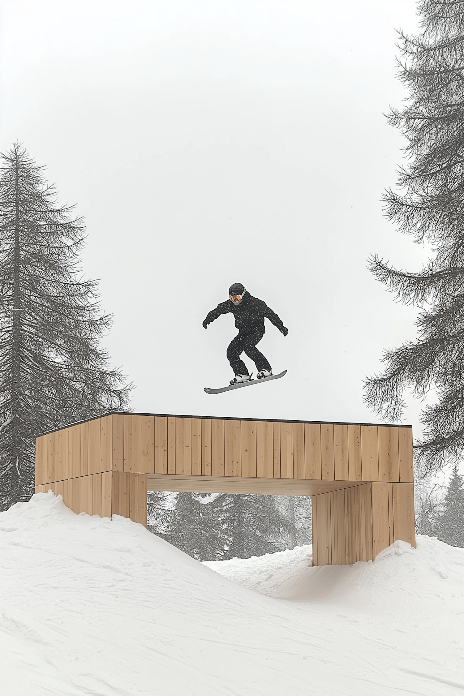 Snowboarder jumps over wooden structure in snowy landscape, dressed in black with goggles. Snow gently falls, creating a serene winter scene.