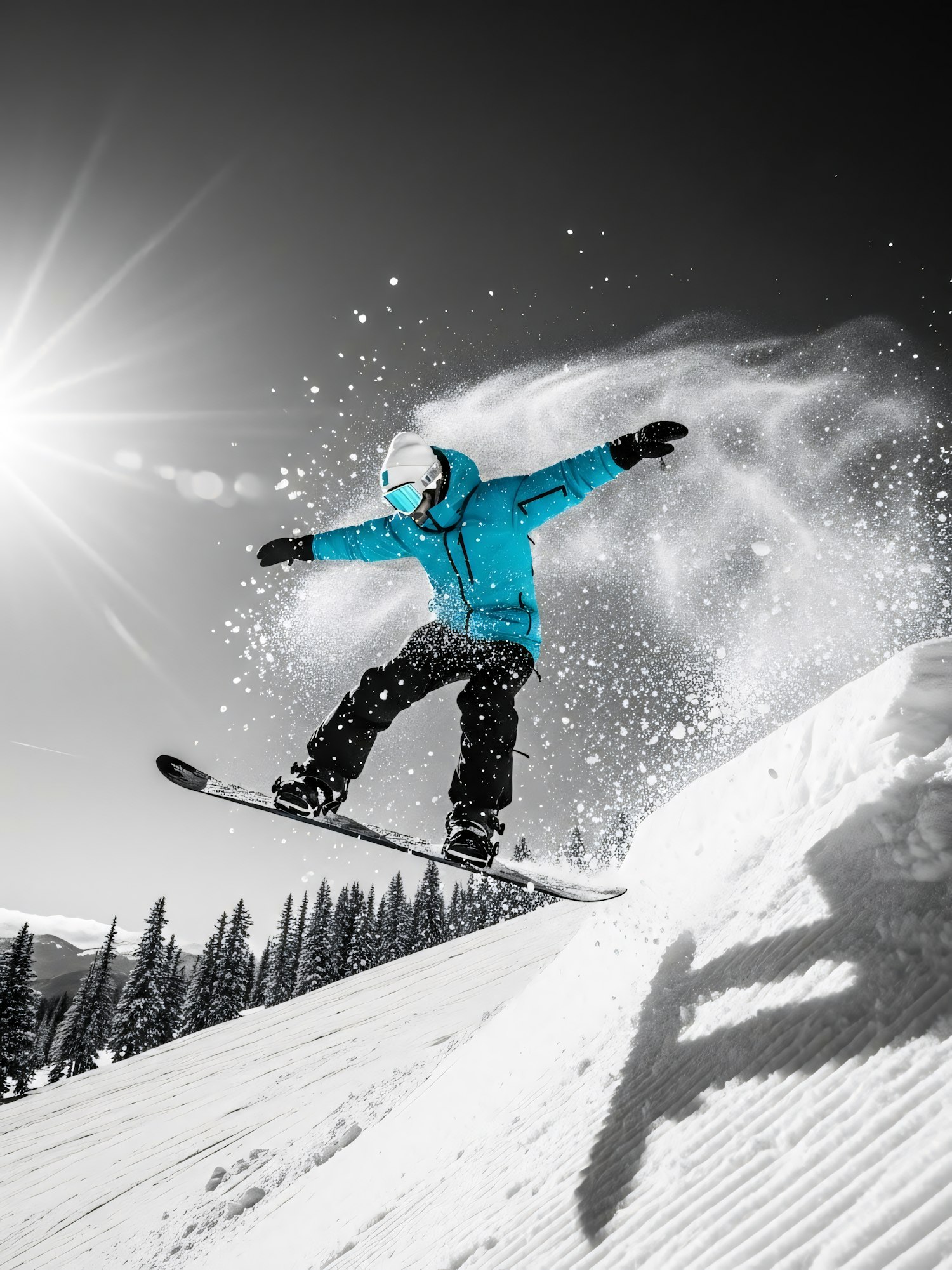 A snowboarder in a blue jacket jumps on a snowy slope, with snow spraying around and a bright sunlit winter landscape in the background.