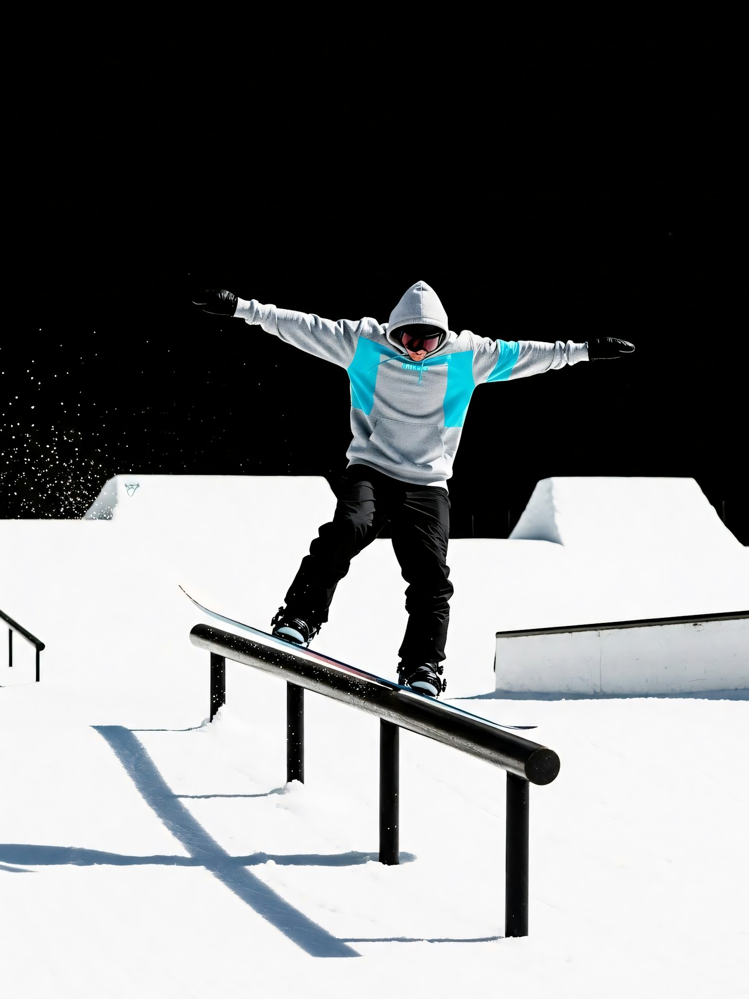 Snowboarder performing a rail slide in a snowy terrain park, wearing a gray and blue hoodie, black pants, and goggles, against a dark background.