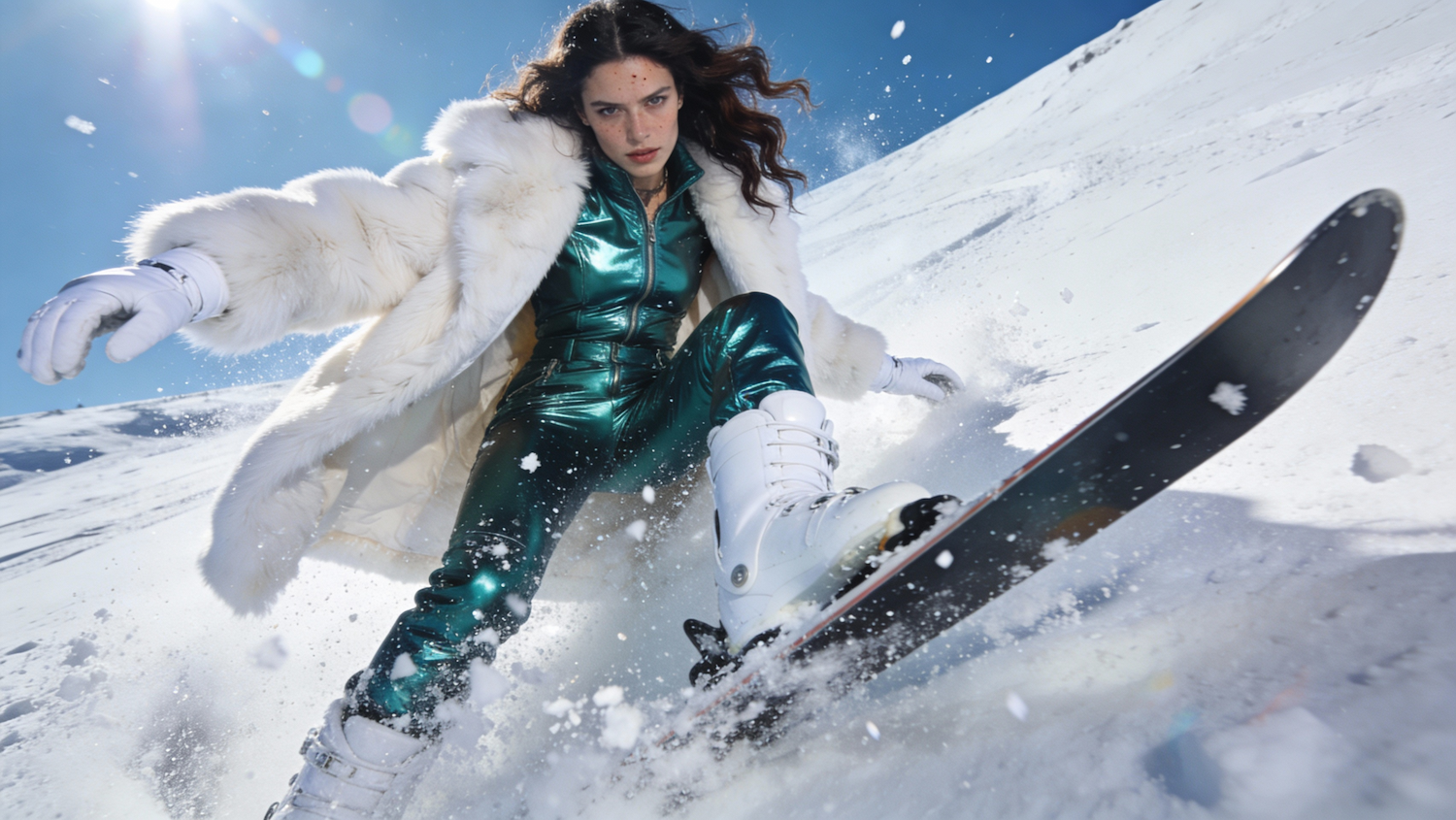 A woman with sharp, extreme, non-conventional high-fashion facial features and long, wavy dark brown hair, wearing a luxurious, avant-garde, oversized pure white faux fur coat open over a metallic emerald green ski suit, is actively carving a turn on a snowboard. She wears sleek white gloves and high-fashion oversized white moon boots. Full-length action shot, aggressive extreme low-angle shot from the snow surface, capturing the spray of snow (powder) kicked up by the board. The model is mid-air or mid-turn, looking down at the camera with a wild, intense, focused expression. The background is a vast, empty expanse of fresh powder on a steep mountain slope under a clear blue sky. Blinding bright midday sun creates intense, almost blinding highlights on the white fur, white boots, and the metallic suit, with ultra-sharp detail on the wind-blown snow crystals. Pin-sharp focus on the movement, the texture of the white fur, the white gloves, the white boots, and the hyper-realistic, imperfect skin (highly visible pores, micro-scars, visible breath fogging in the frigid air). Cinematic quality, shot on Cinestill 800T film, subtle anamorphic lens flare, deep contrast, hyper-detailed photo realism, sharp focus on subject, blinding bright midday sun, harsh highlights, visible snowflakes/ice crystals, extreme texture detail.