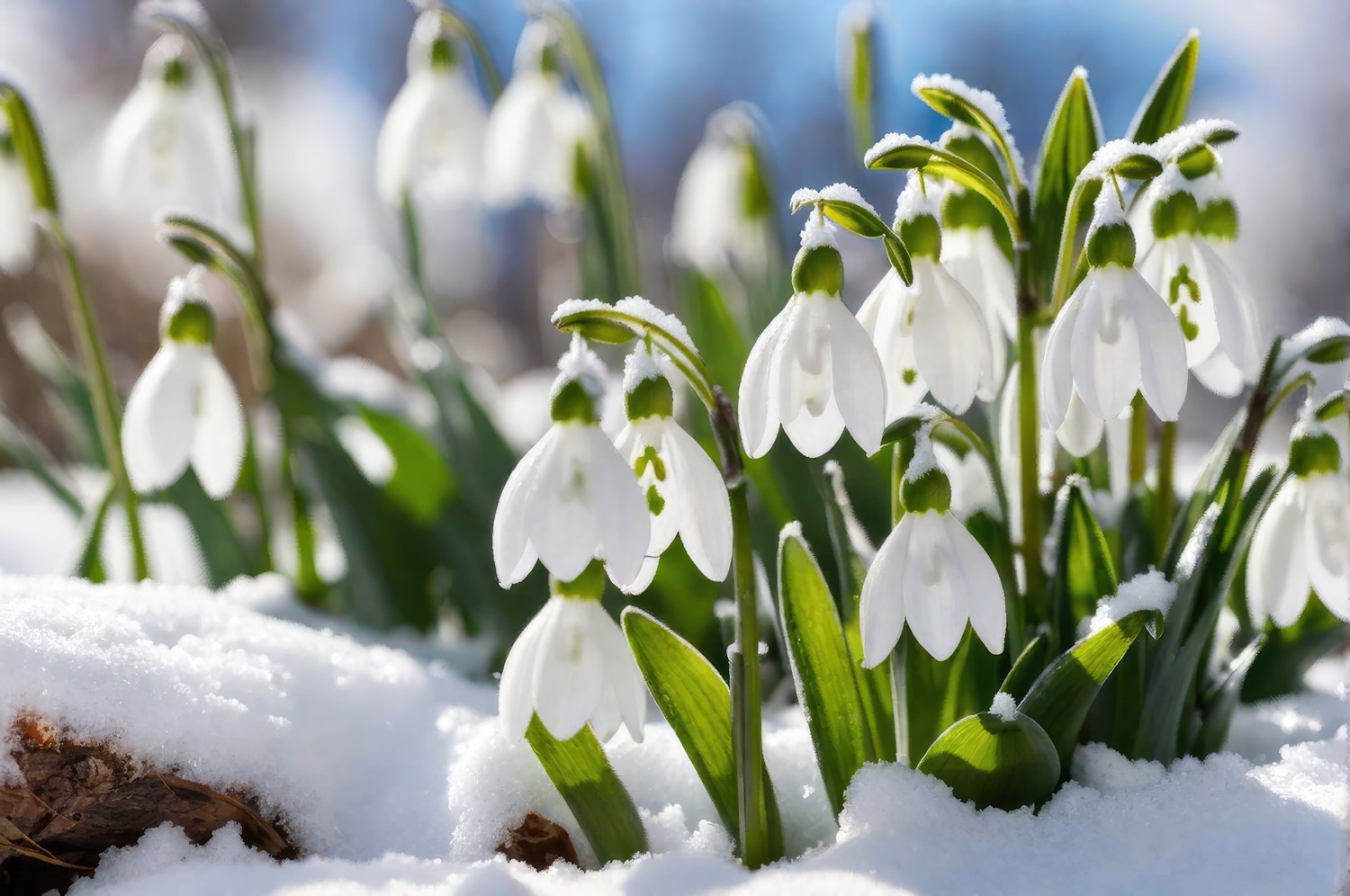 Snowdrops bloom through the snow, showcasing nature's resilience with delicate white petals and vibrant green leaves.