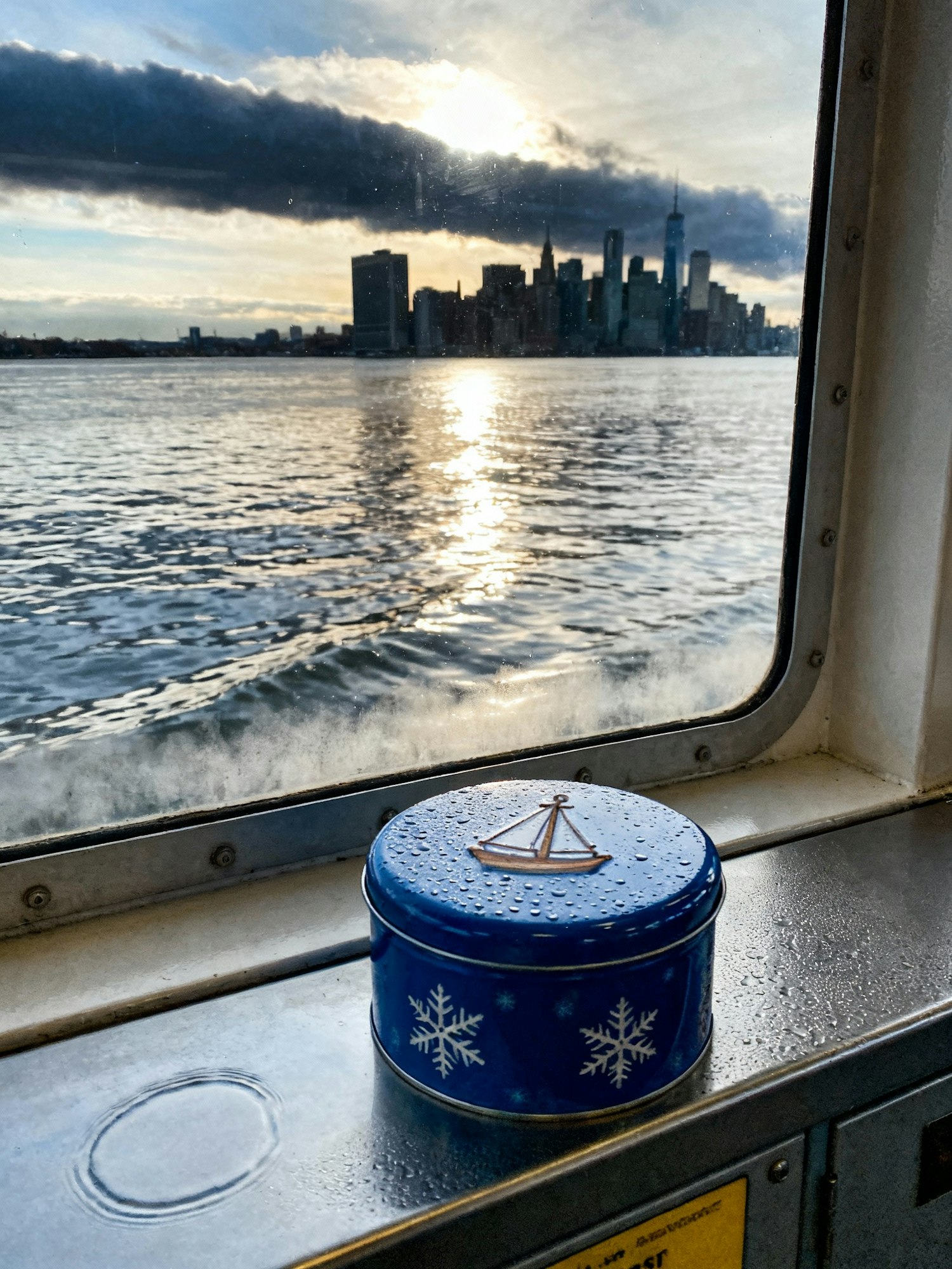A festive blue tin on a ferry windowsill with a stunning city skyline and sunset reflecting on the water in the background.