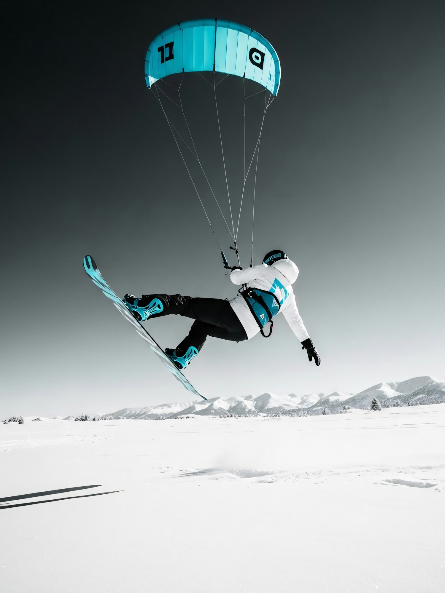 A snowkiter in mid-air with a vibrant blue kite, set against a snowy mountain backdrop, showcasing dynamic motion and adventure.