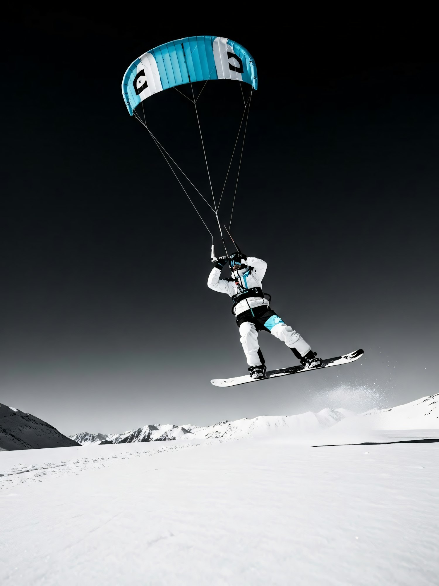 A snowkiter in mid-air with a blue kite and snowboard, set against a snowy mountain landscape and a clear, dark sky.