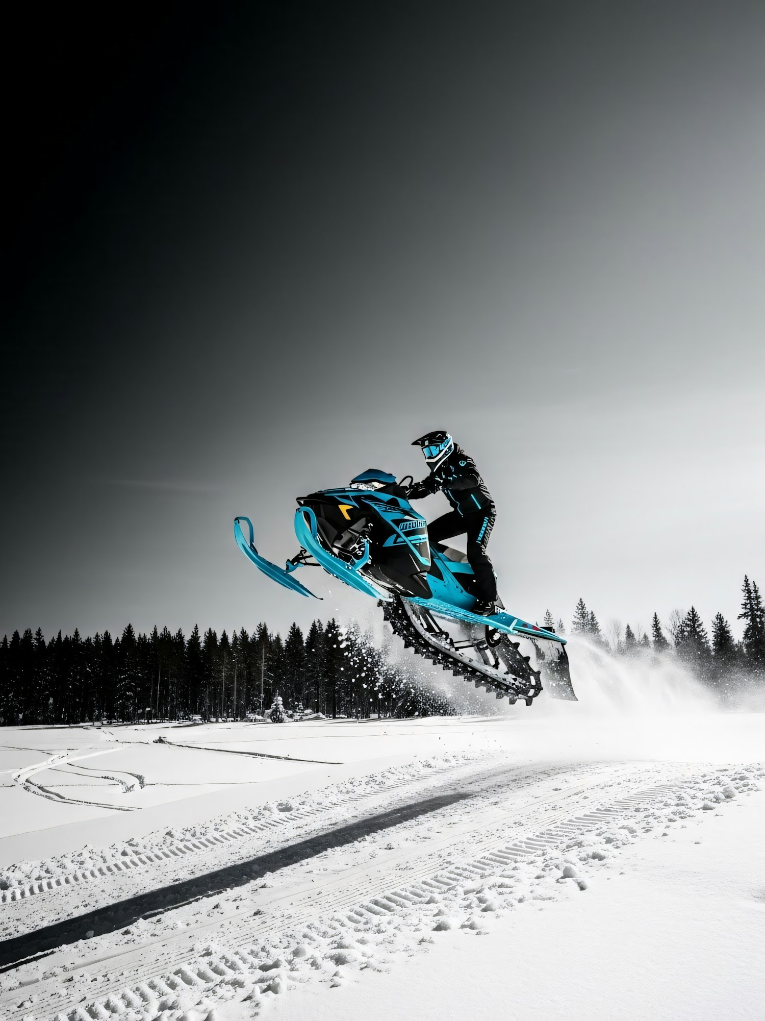 A snowmobile rider jumps through the air on a snowy landscape, with a vibrant blue snowmobile and a forest backdrop under a clear sky.