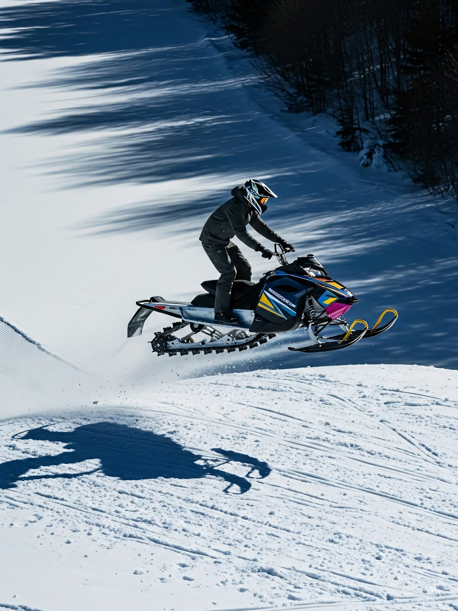 A snowmobile rider jumps on a snowy slope, casting a dramatic shadow, with a forested backdrop and pristine white snow.