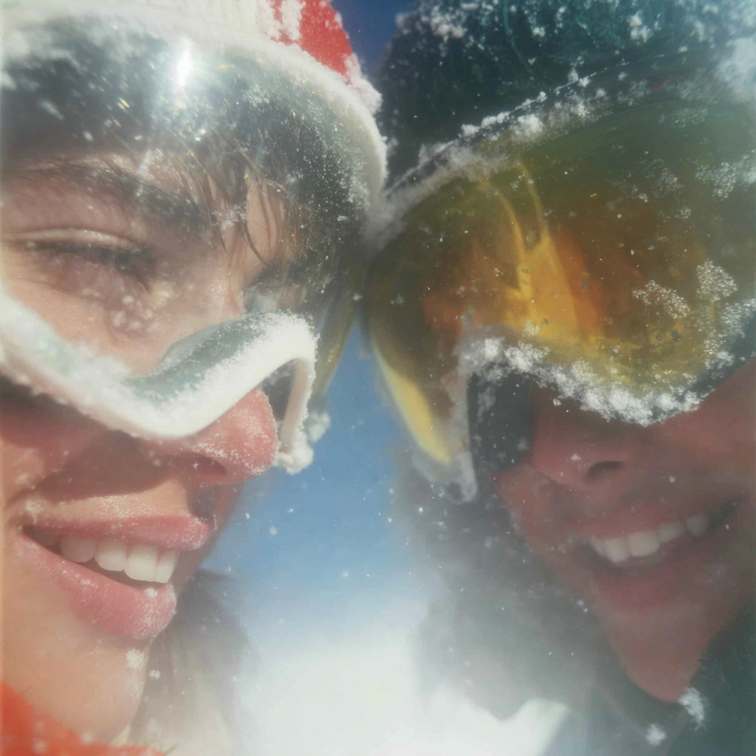 Close-up of two smiling individuals in ski goggles, enjoying a snowy day under a clear blue sky.