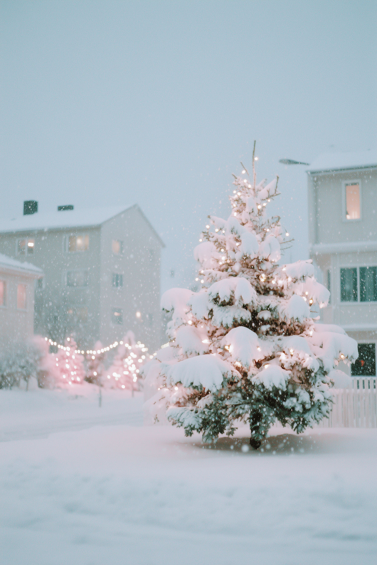 A snow-covered Christmas tree with warm lights in a serene winter yard, surrounded by softly lit houses and falling snow.