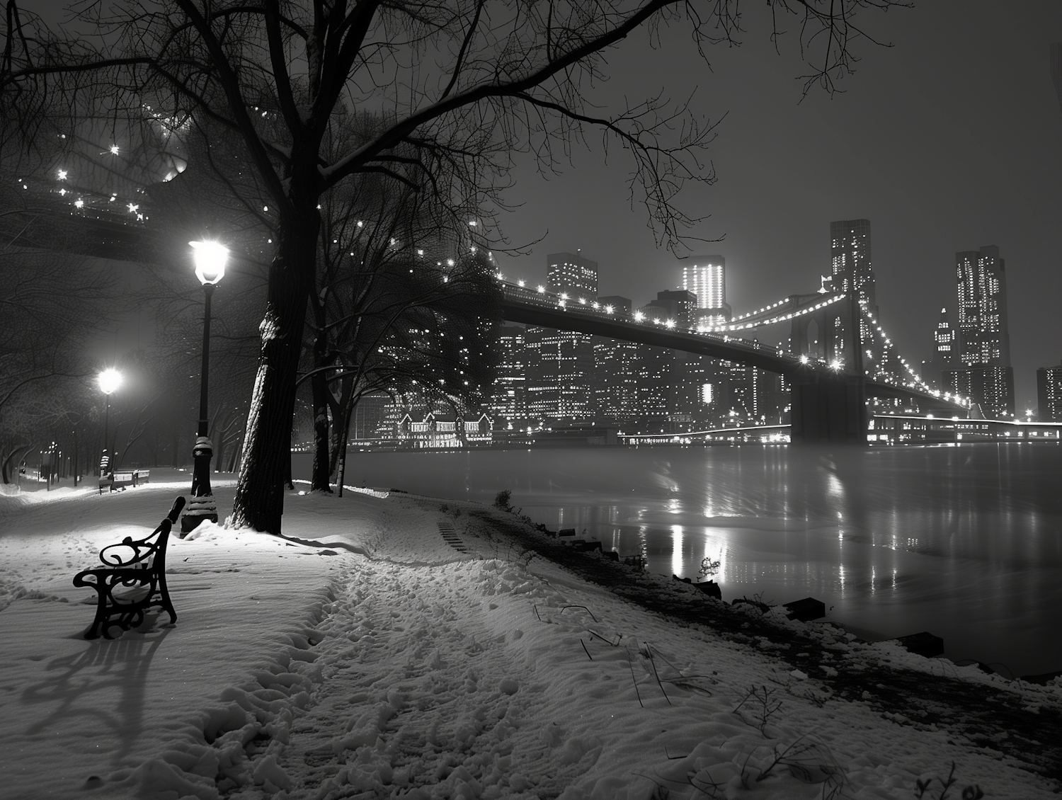 Snowy park path at night with illuminated bridge and city skyline in the background, creating a serene winter scene.