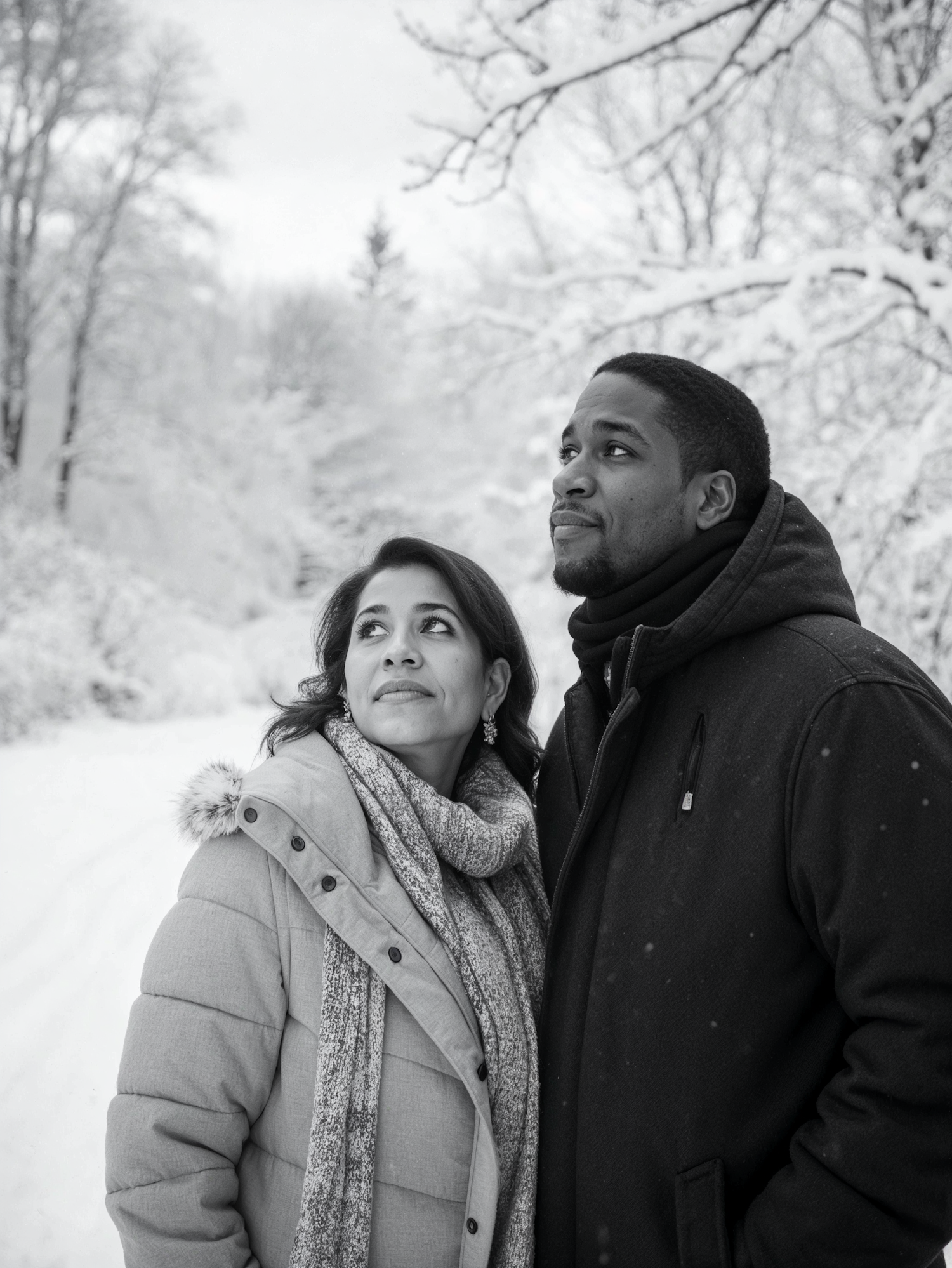 Black-and-white photo of a couple in winter attire gazing upward in a serene snowy landscape with snow-covered trees.