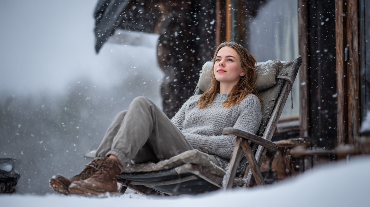 A woman relaxes in a snowy outdoor setting, seated on a chair near a rustic cabin, wearing a gray sweater and boots, surrounded by falling snow.