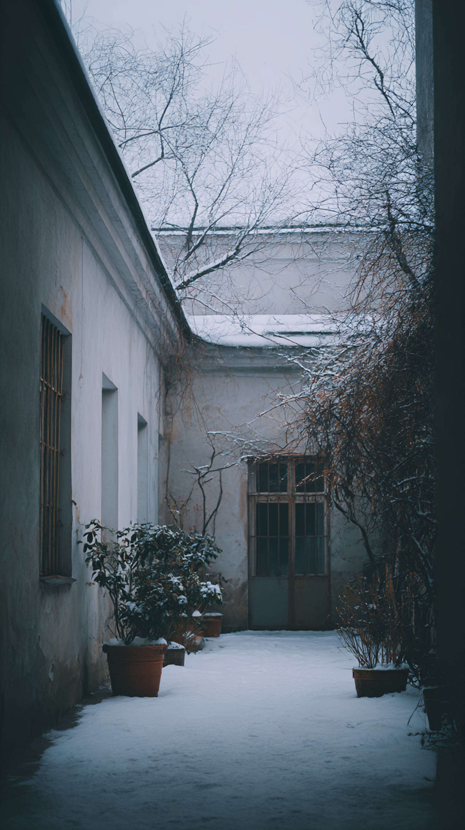A quiet snow-covered courtyard with potted plants, bare trees, and a weathered door, evoking a serene and timeless atmosphere.