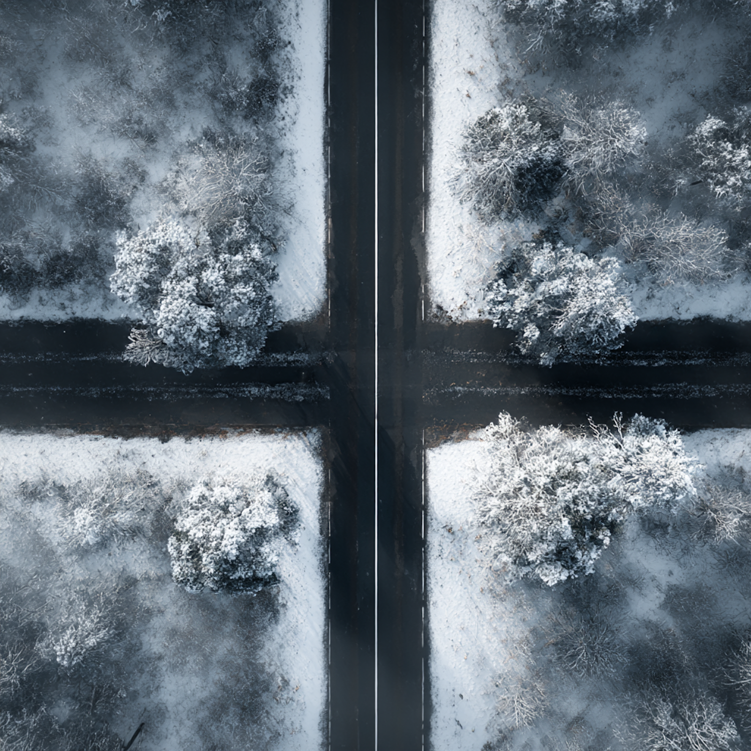 Aerial view of a snowy crossroad surrounded by frost-covered trees, showcasing a serene winter landscape with striking contrasts.