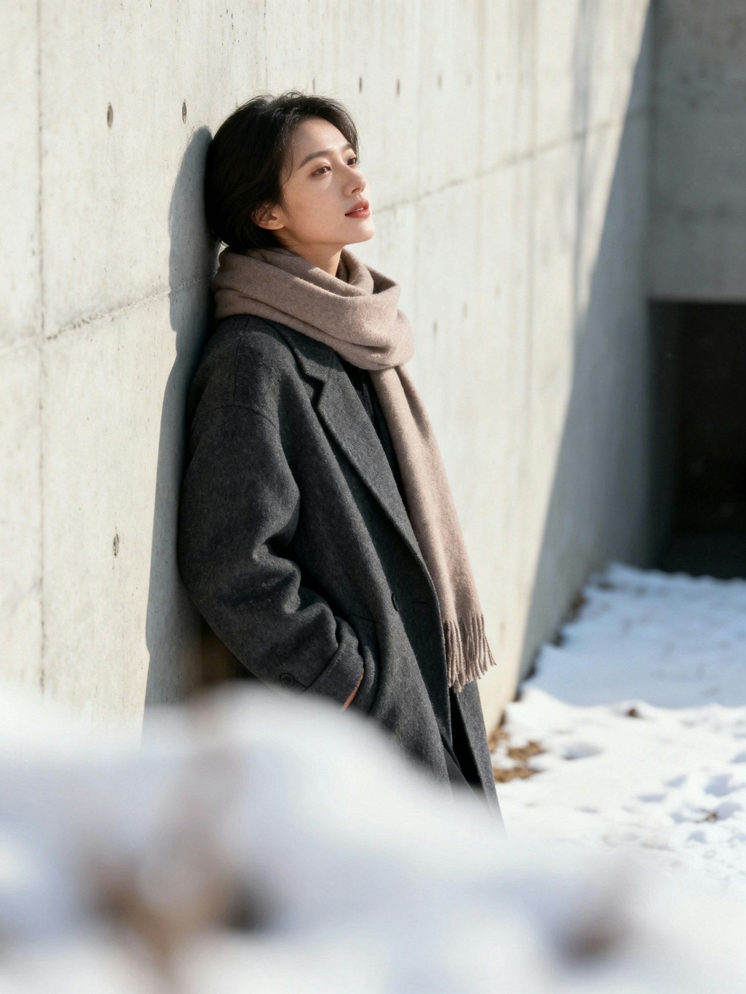 A person in a gray coat and beige scarf leans against a concrete wall on a snowy day, creating a serene and minimalist scene.