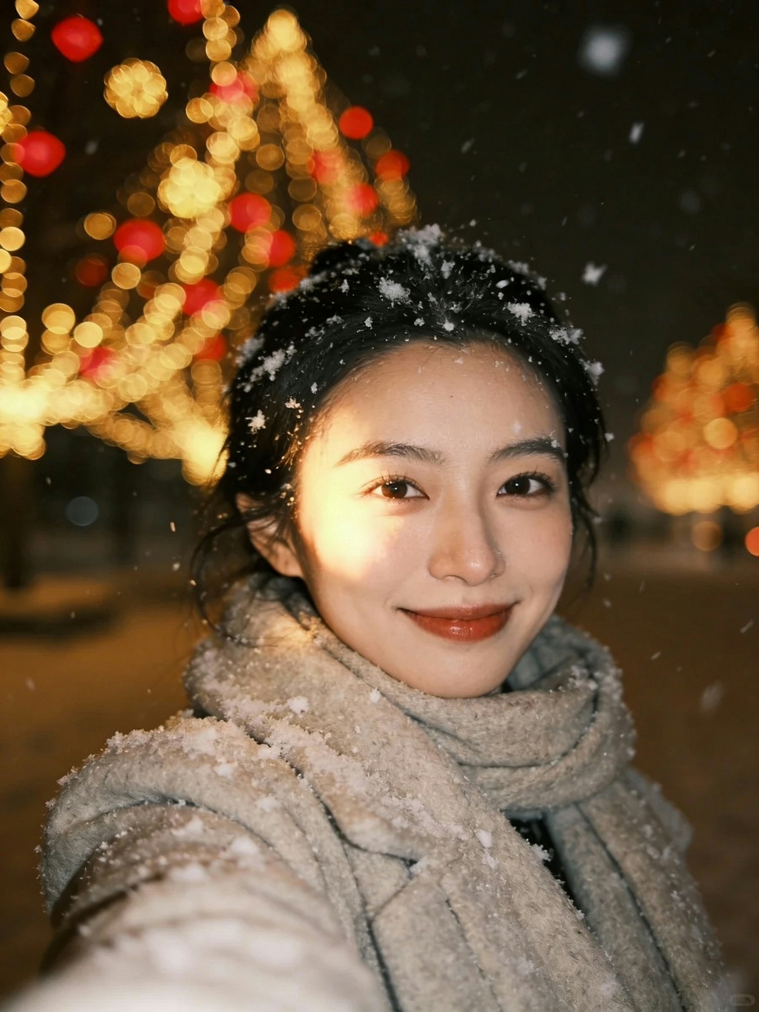 A cheerful woman in a snowy evening selfie, surrounded by festive lights and a magical winter ambiance.