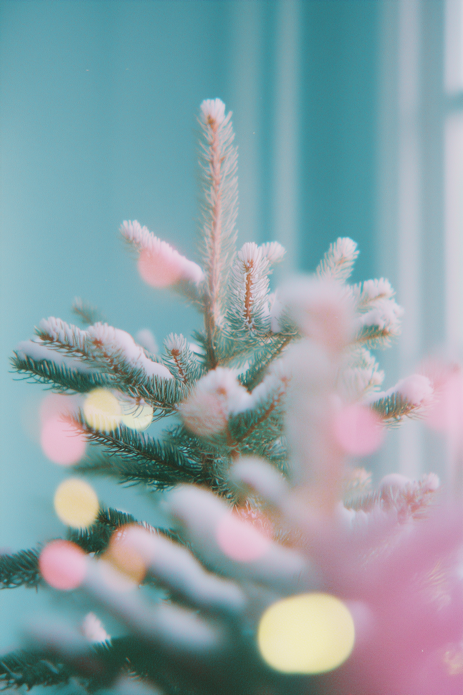 A snow-covered evergreen branch with colorful bokeh lights against a soft blue background, creating a dreamy winter scene.