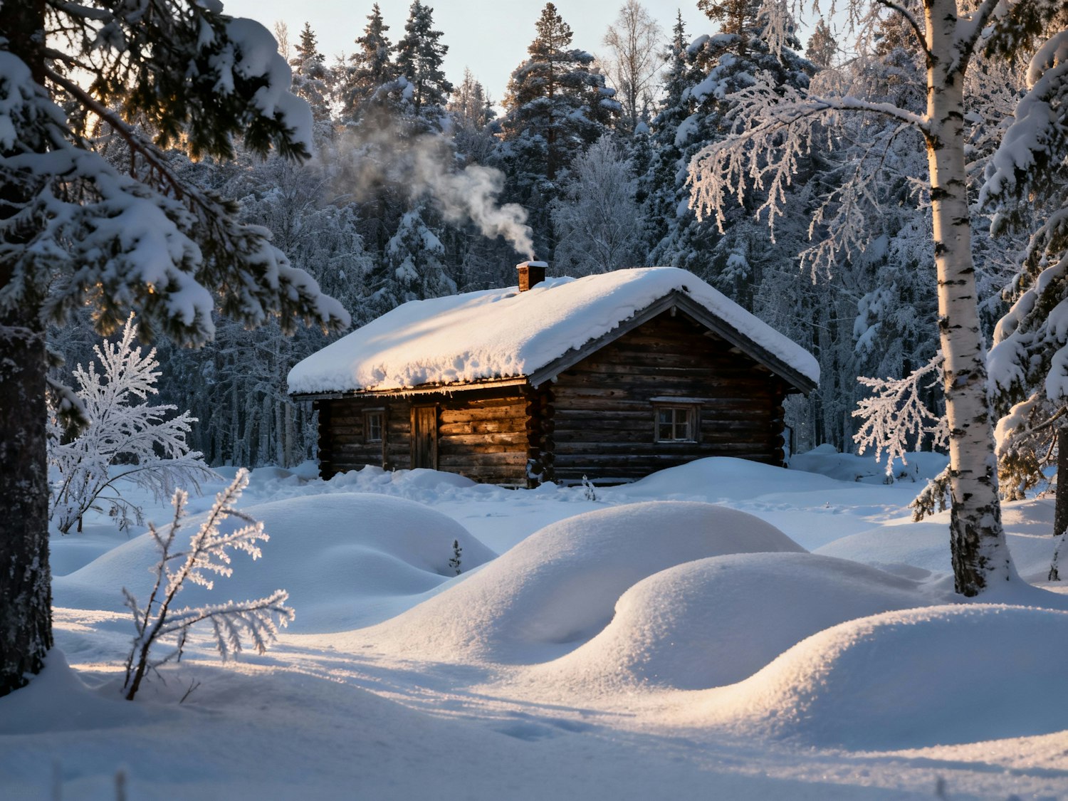 A cozy wooden cabin in a snowy forest, with smoke rising from the chimney and sunlight illuminating the frosty landscape.
