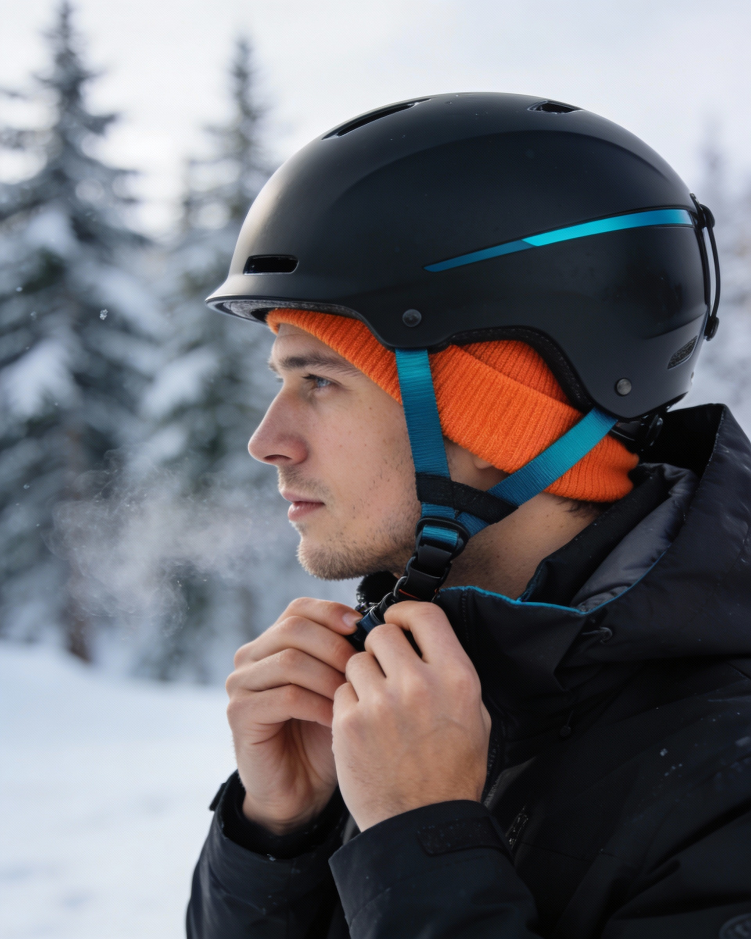 A person adjusts their black helmet in a snowy outdoor setting, wearing an orange knit hat and a black jacket.