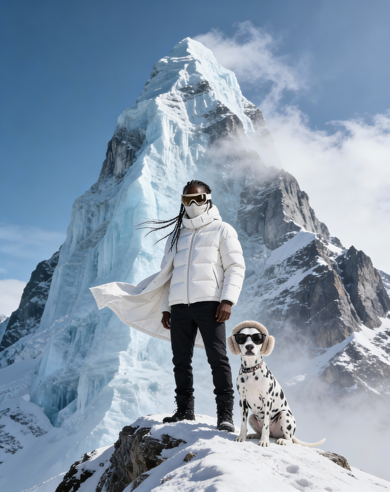 A stylish individual and their Dalmatian companion pose on a snowy peak with a majestic icy mountain in the background.