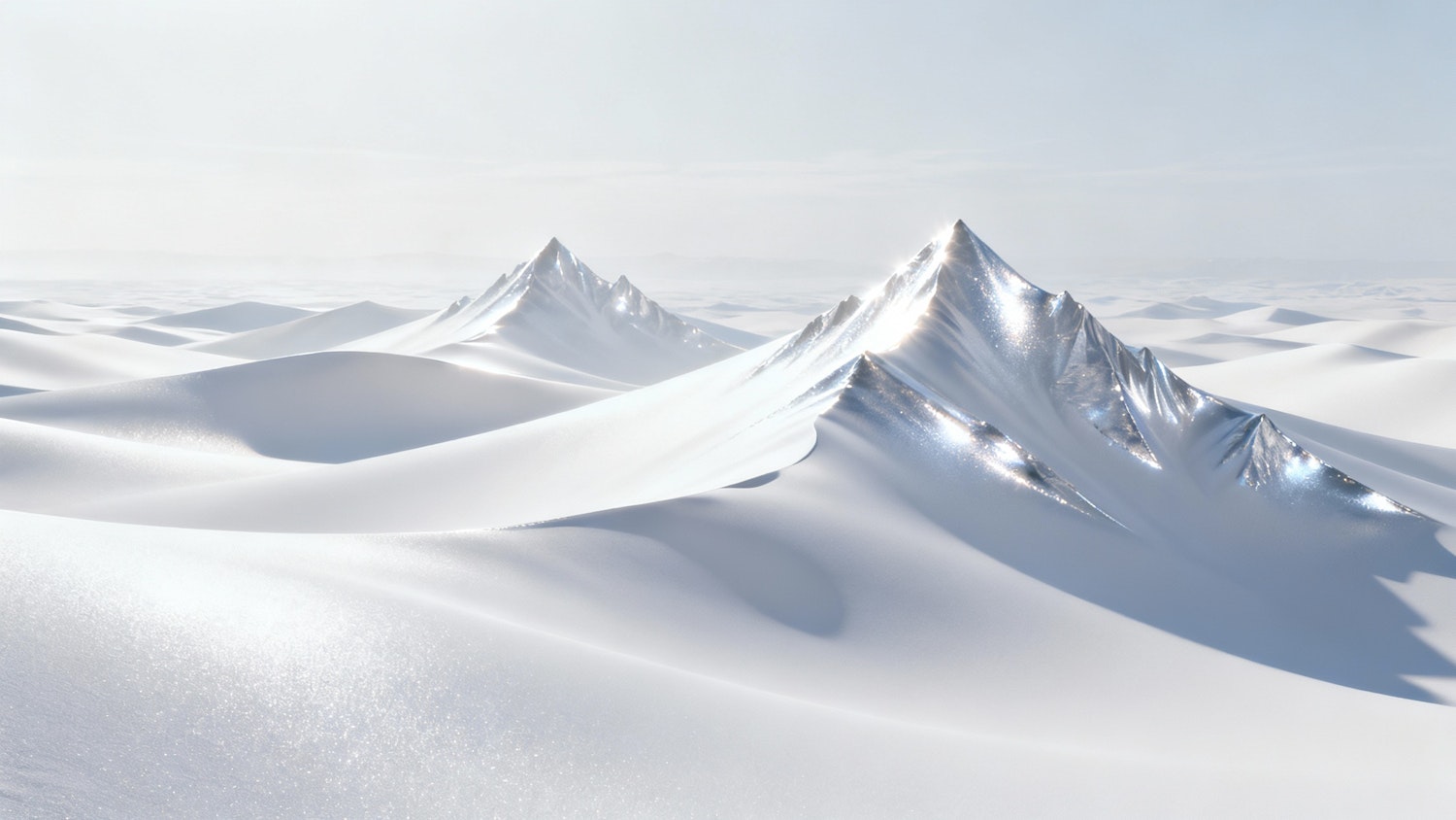 hyper stylized scenery image, a white futuristic desert, with a shimmer with a slight gloss finish on the peaks of the dunes