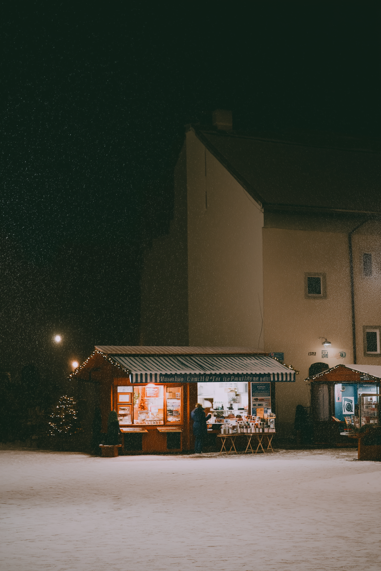 A brightly lit food stall on a snowy night at a Christmas market, with festive decorations and a peaceful ambiance. Snow blankets the ground and softly falls.