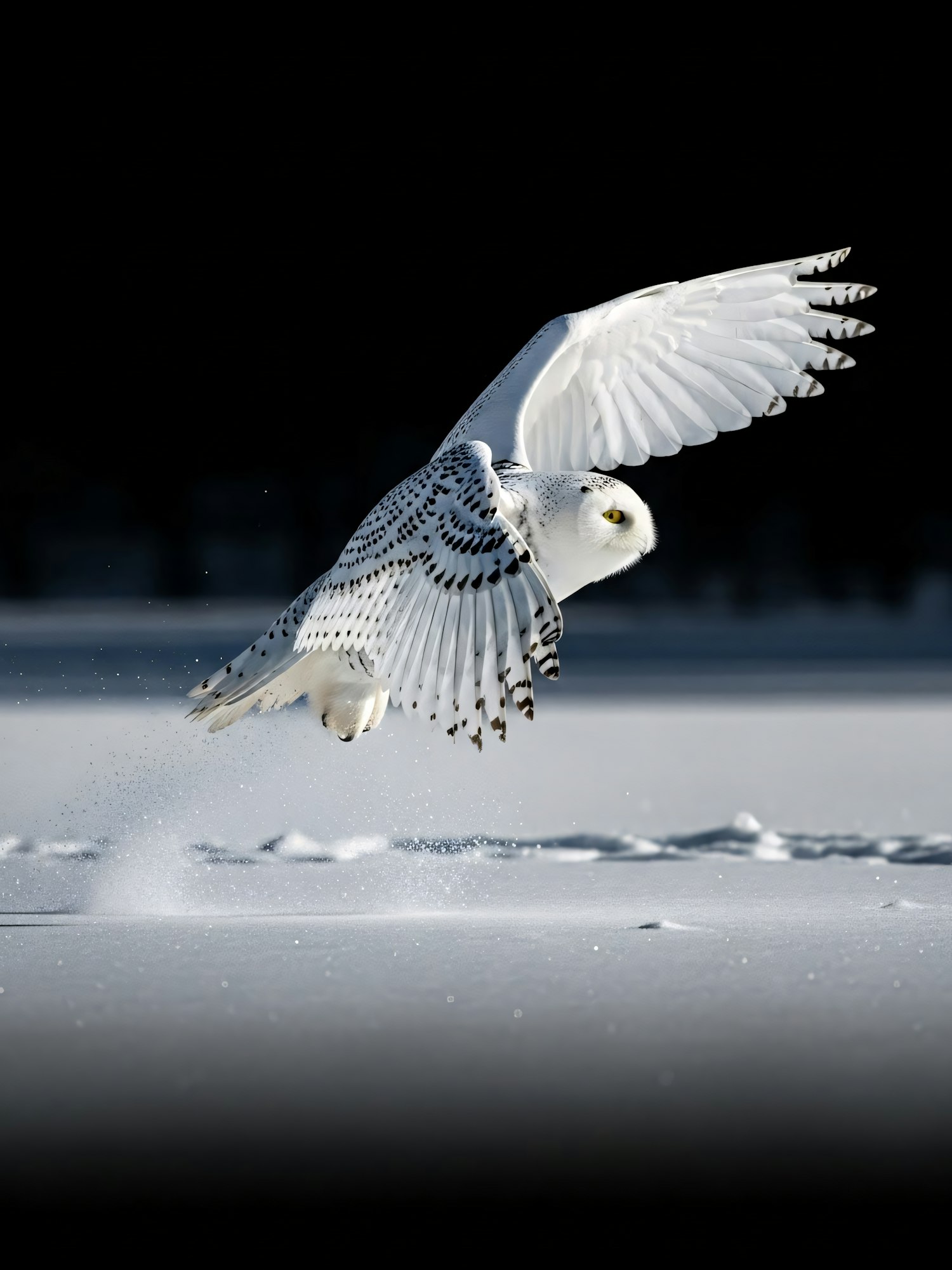 A snowy owl in flight over a snowy landscape, its white feathers and yellow eyes striking against a dark background.