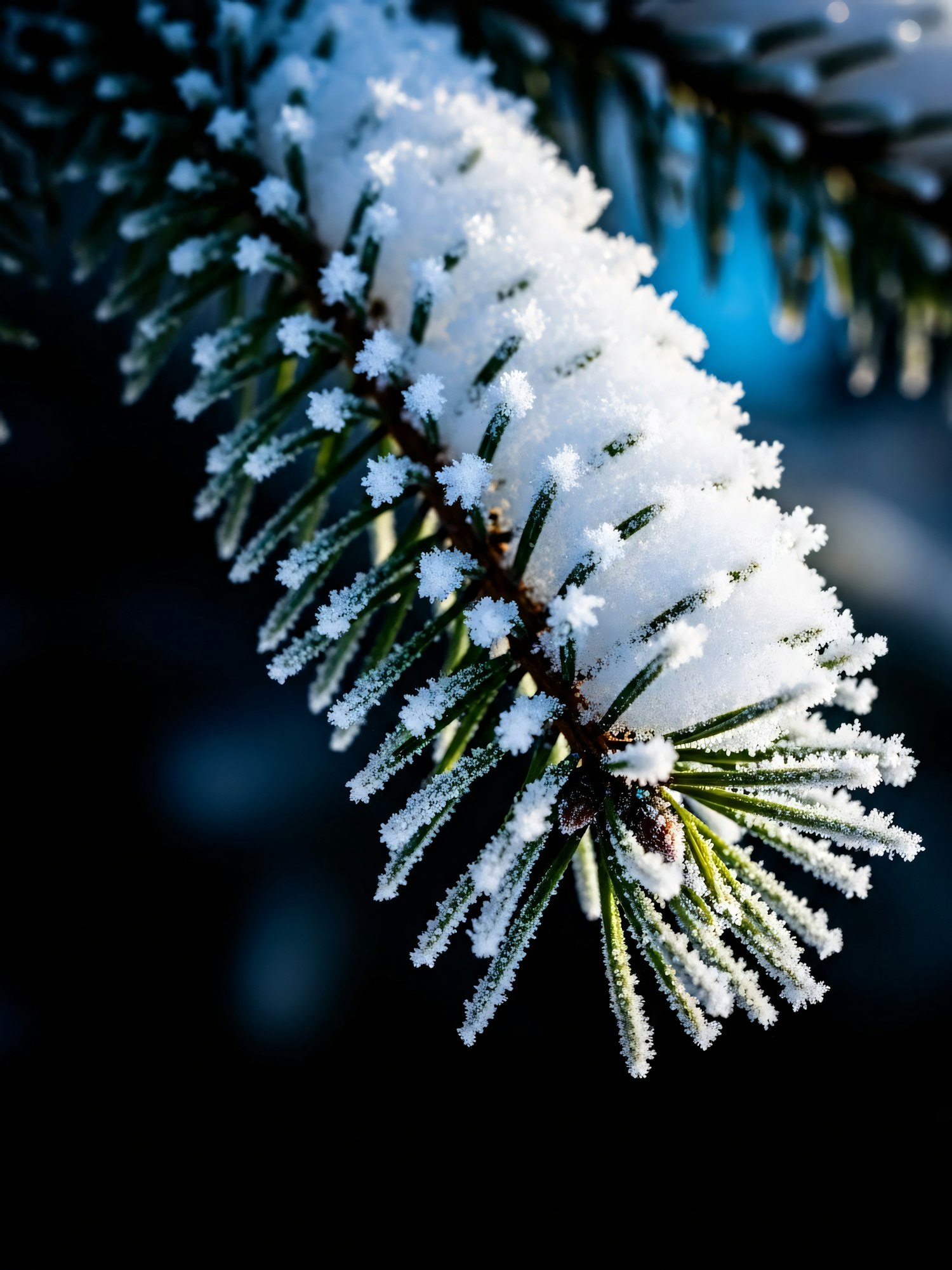 A close-up of a snow-covered pine branch, showcasing the intricate details of the needles and the crystalline snow.