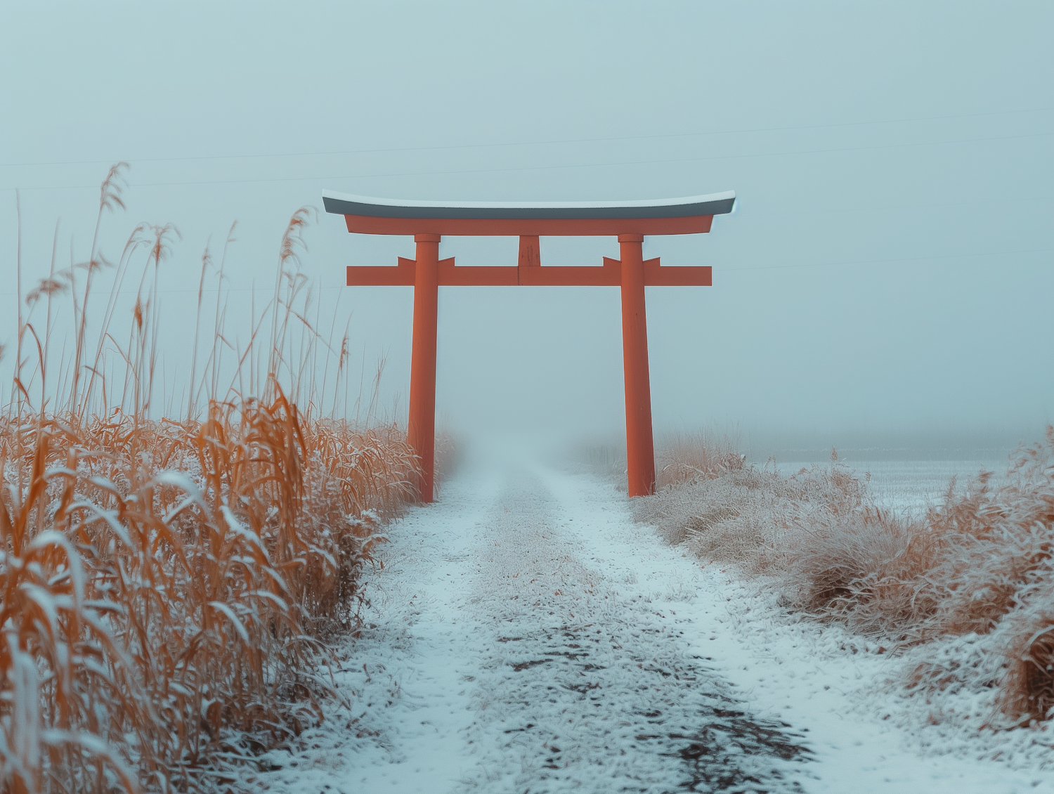 A red torii gate stands in a snowy, foggy landscape, creating a serene and mystical atmosphere.