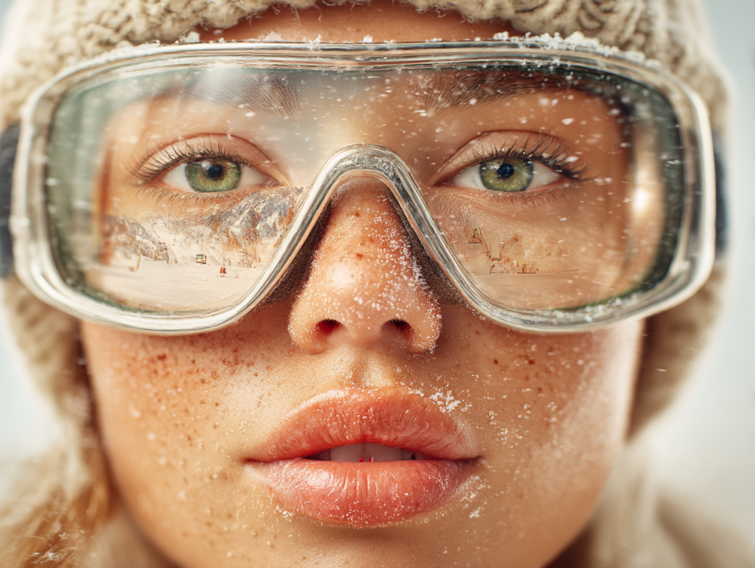 Close-up of a person wearing ski goggles reflecting a snowy mountain scene, with freckles and snowflakes on their face, evoking winter vibes.