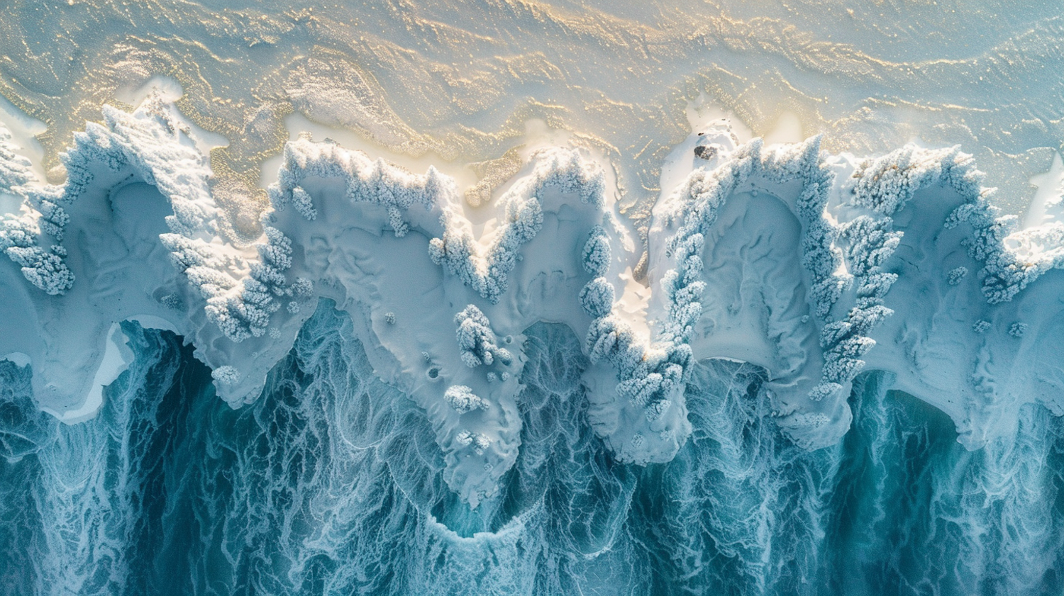 Aerial view of snow-covered cliffs meeting a turbulent icy blue ocean, with golden sunlight casting a warm glow on the frosted landscape.