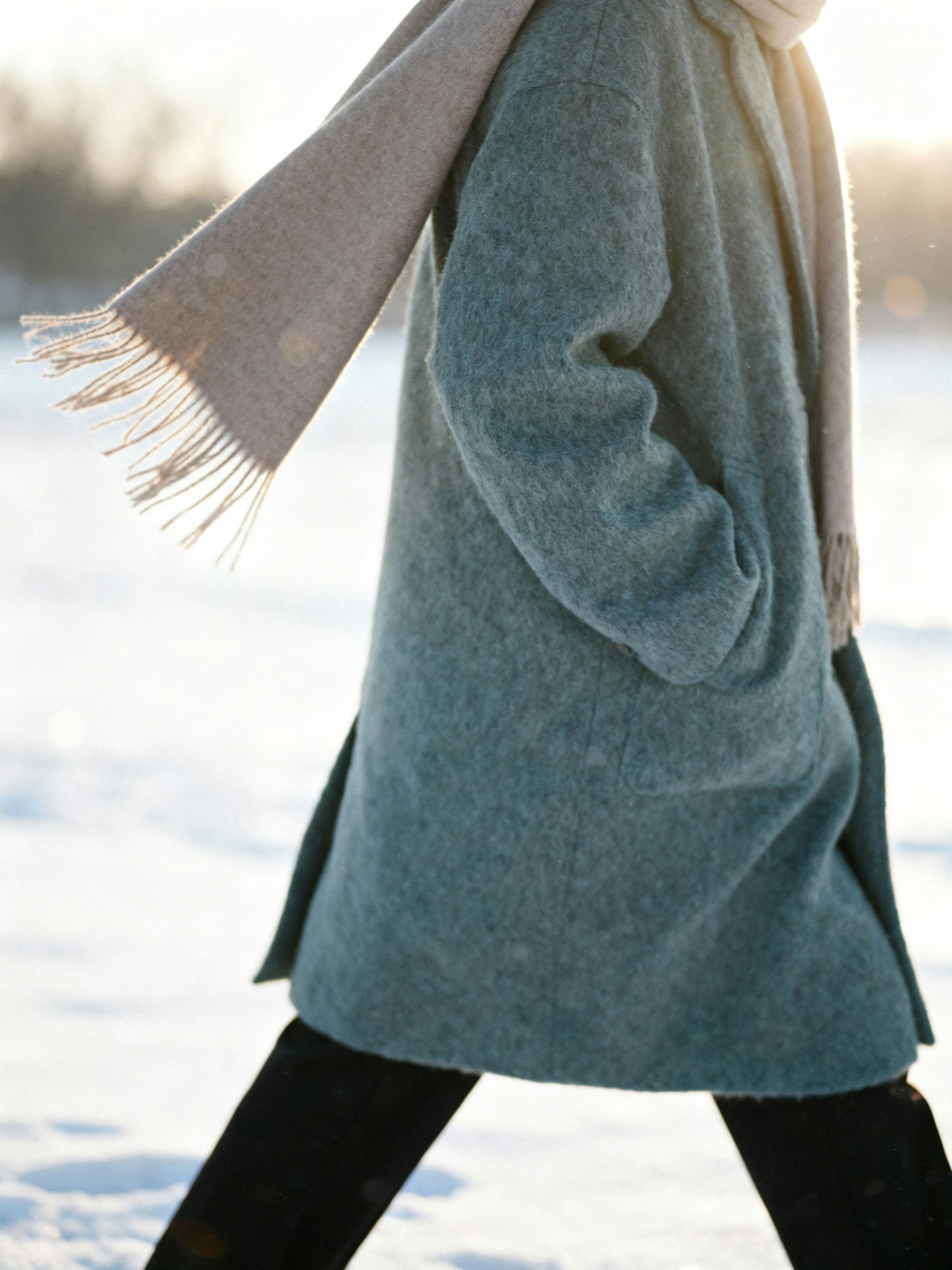 Soft winter lifestyle photo in gentle sunlight, muted grey-oat palette, shallow DOF. A person walking slowly while their soft taupe scarf sways lightly in a small winter breeze, dusty-blue wool coat moving subtly with the step, calm candid motion adding a live, natural feel. Negative: strong wind, chaotic hair, oversaturated colors.