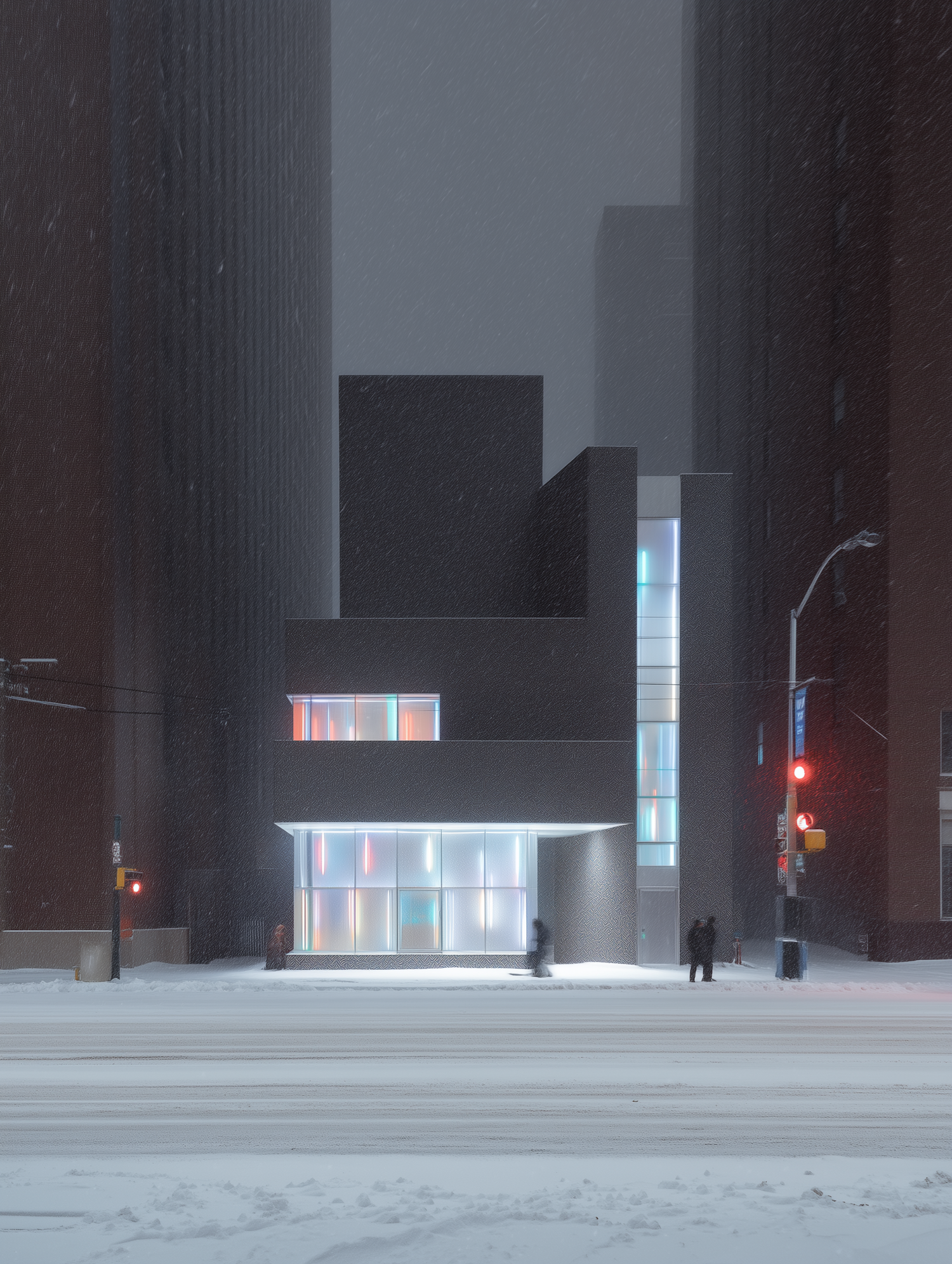 A modern building with colorful illuminated panels stands in a snowy urban setting, surrounded by tall structures and a serene atmosphere.
