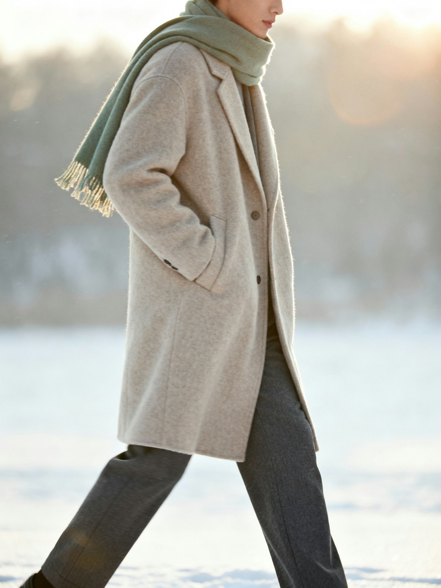 A person in a beige coat and green scarf walks in a snowy landscape, with sunlight creating a warm contrast to the cold setting.