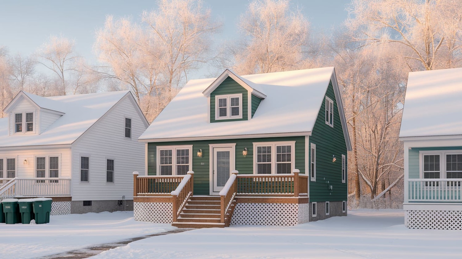 Charming snow-covered houses in a serene winter setting, with frosty trees and soft sunlight creating a cozy, picturesque vibe.