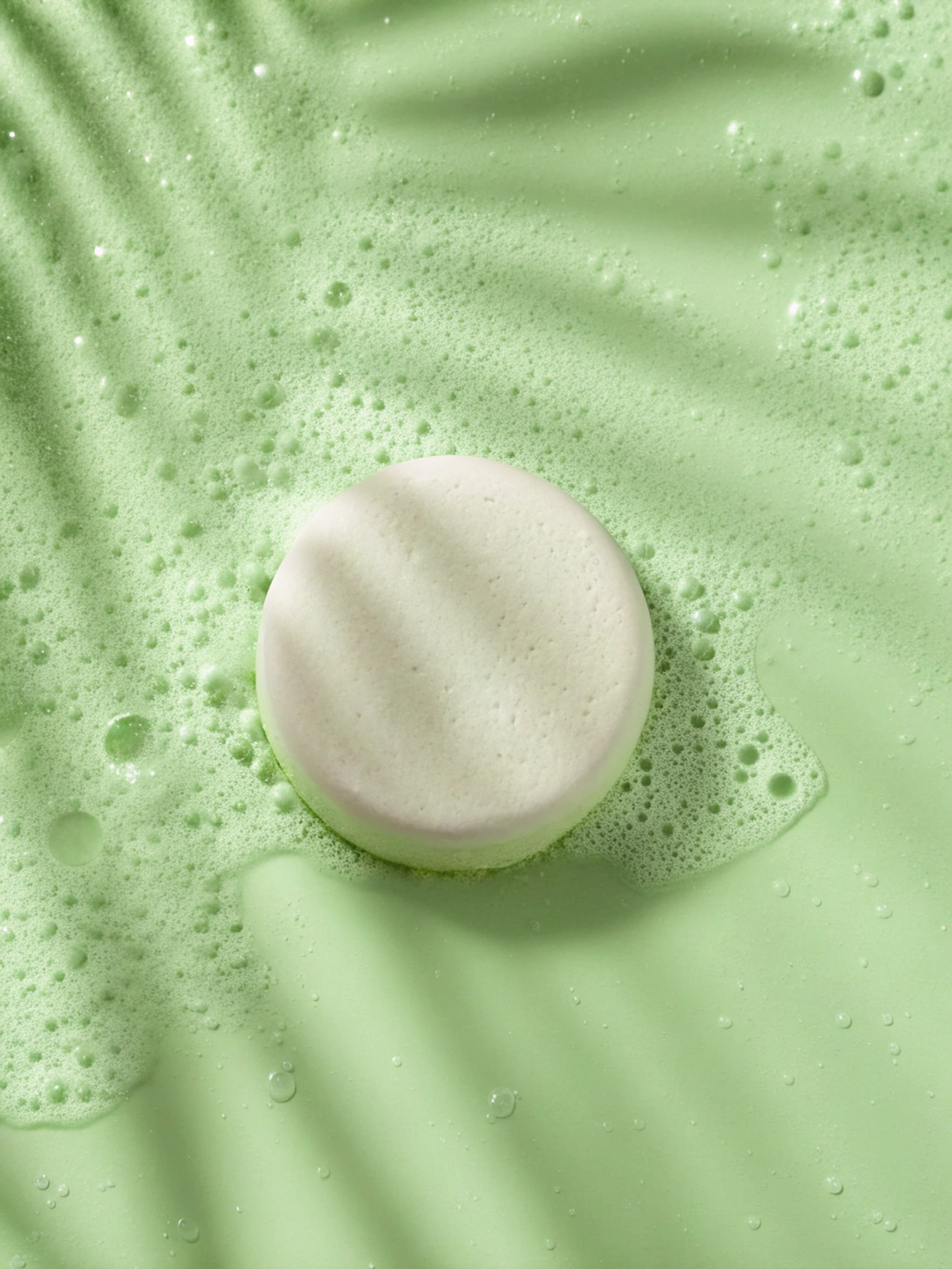 Minimalist shot of a white soap bar on light green foam with bubbles, creating a fresh and clean aesthetic.