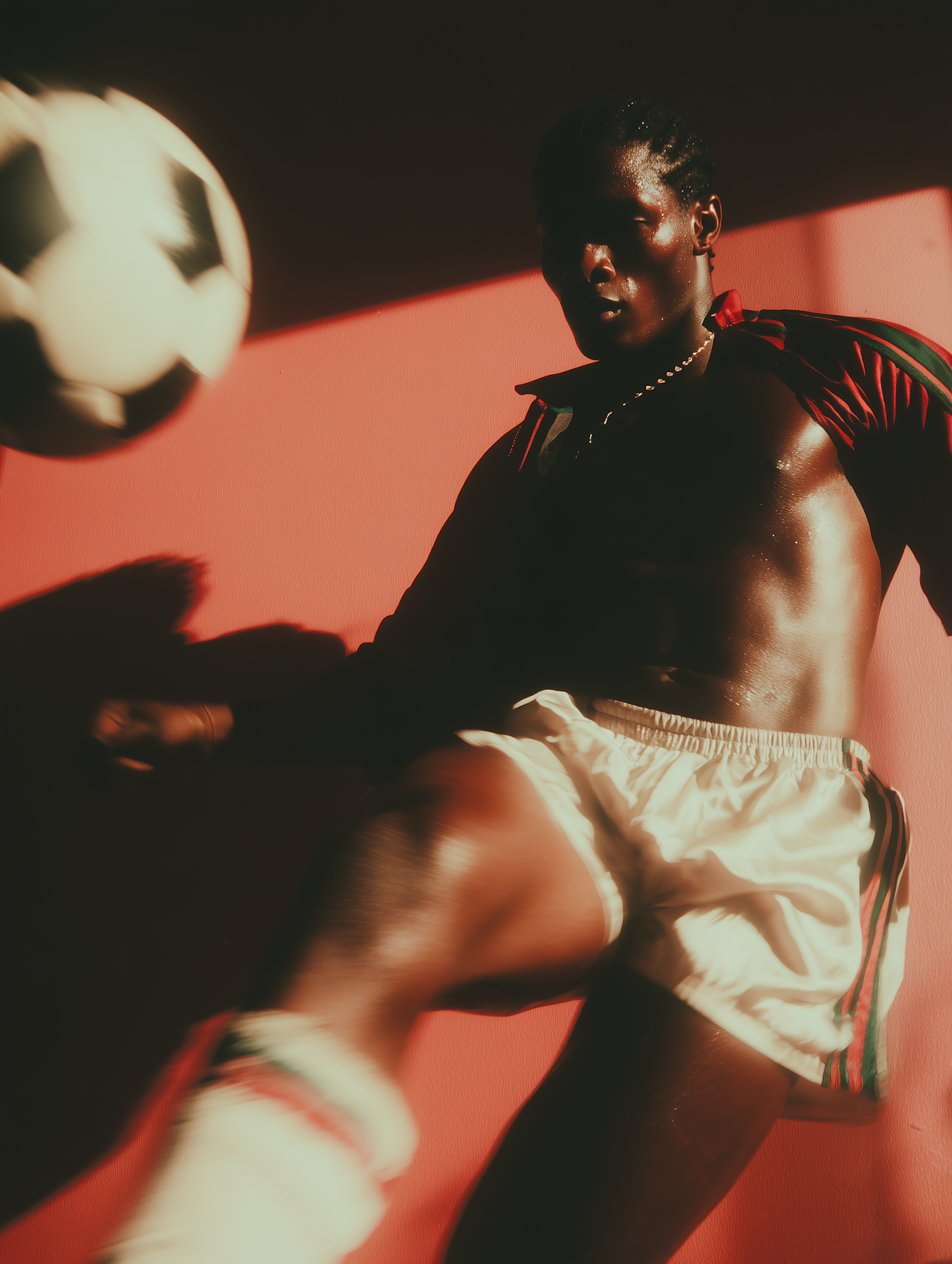 A soccer player in motion, captured dynamically with vibrant lighting and a bold red background, emphasizing energy and athleticism.