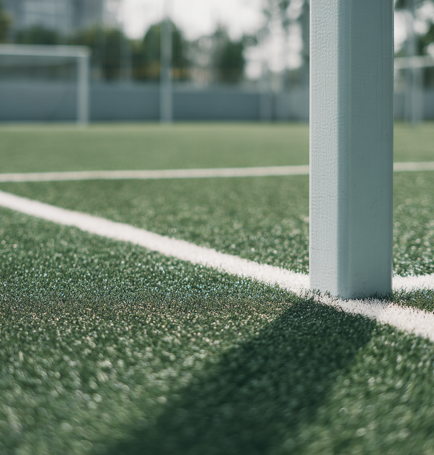 Close-up of a soccer field with artificial turf, featuring a white goalpost and boundary lines under bright daylight.