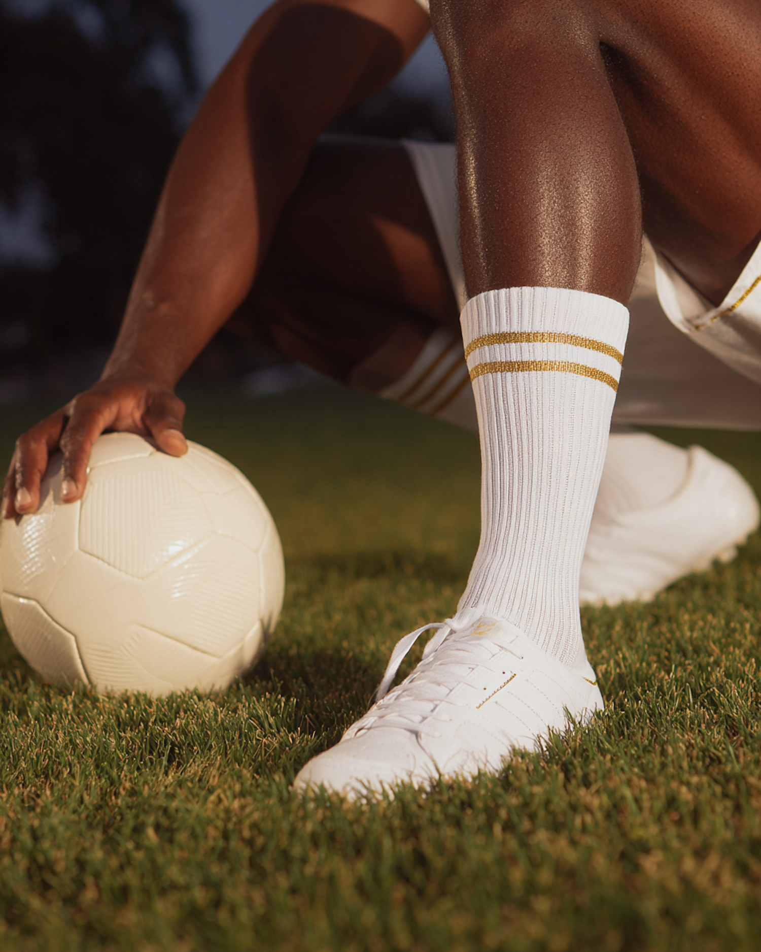 Close-up of a soccer player crouching on a field, wearing white cleats and socks, with a hand on a white soccer ball. Vibrant and dynamic.