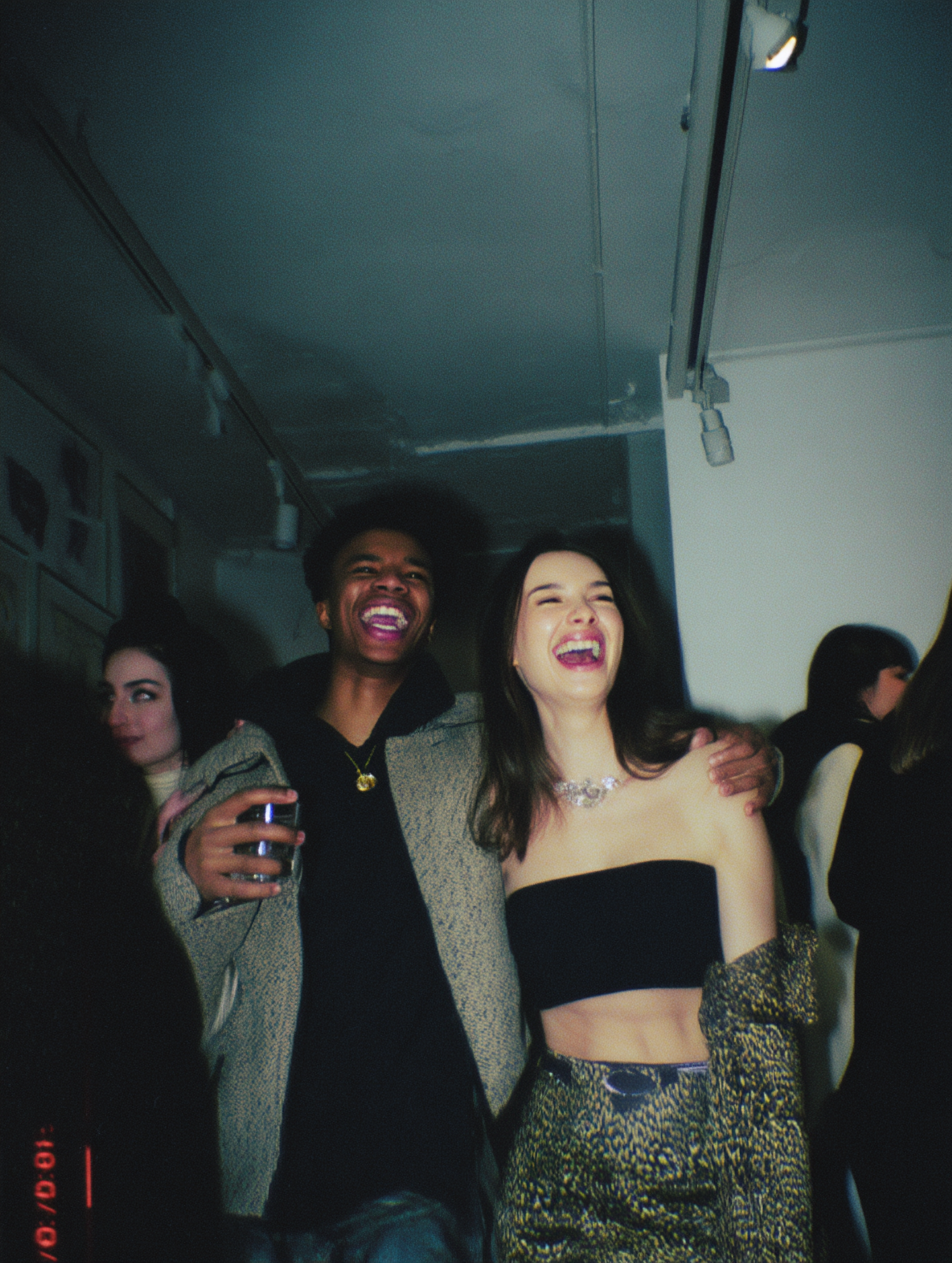 Two friends laughing and enjoying a party, dressed stylishly in a dimly lit, modern setting with a lively atmosphere.