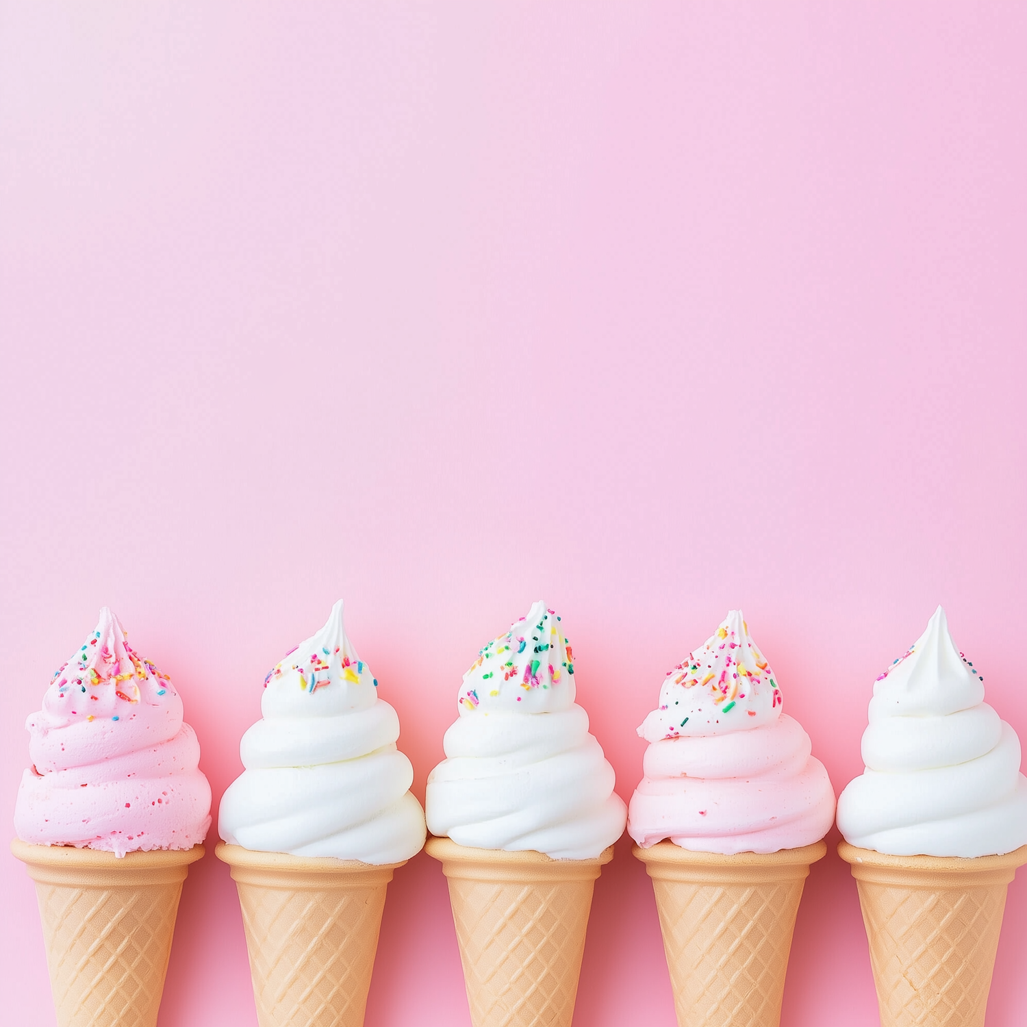 Five soft-serve ice cream cones with sprinkles on a pastel pink background. A mix of white and pink swirls creates a fun, summery vibe.