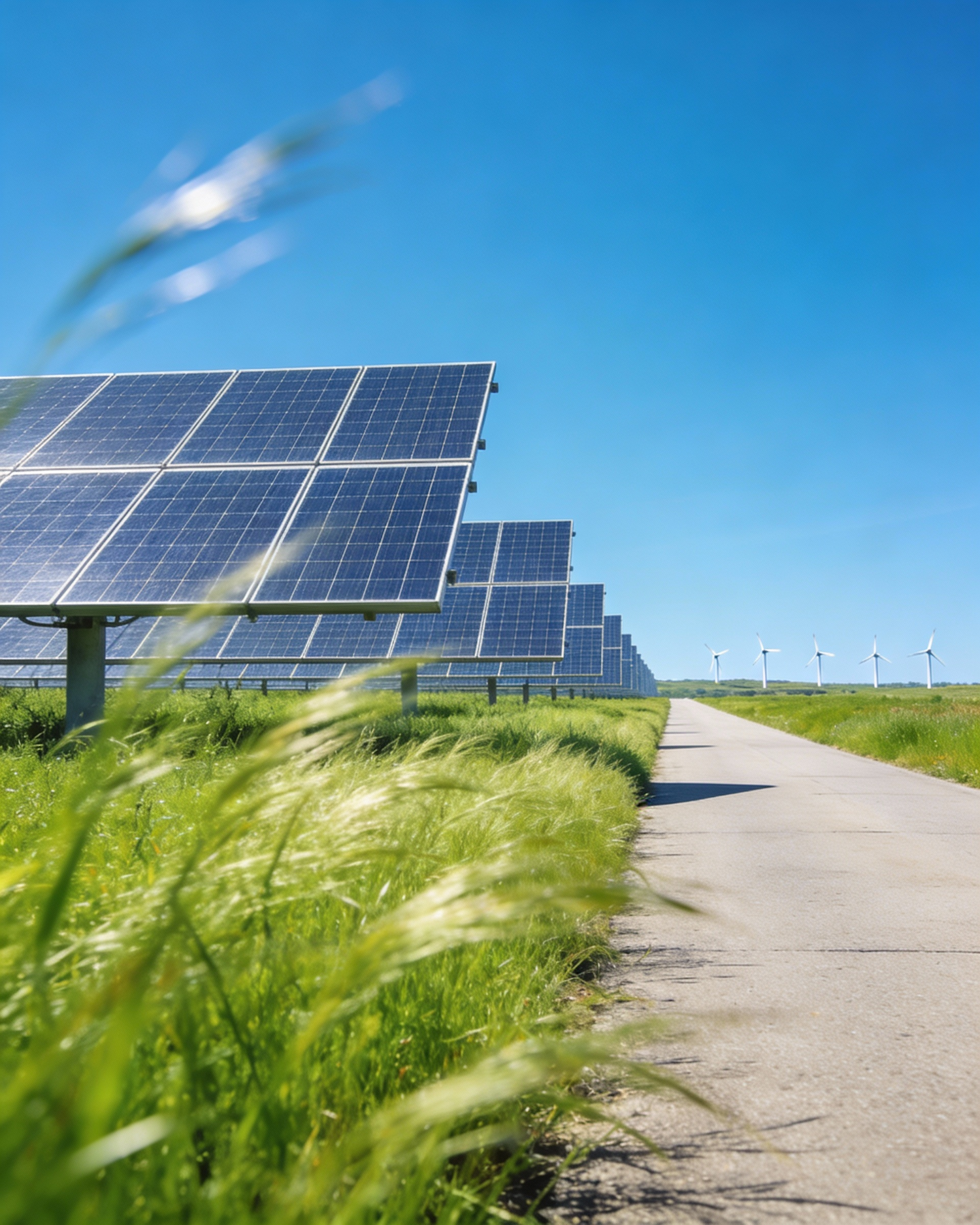 Ultra-realistic landscape photograph, , solar panel array beside a vivid green meadow with tall grasses in the foreground, a clean access road leading toward the panels, turbines tiny on the horizon, horizon low third with wide clear blue sky, bright sunny light with controlled reflections on panels (CPL), vibrant but realistic colors, slight motion in grass, 24 mm, f/7.1, ISO 100, 1/250 s; circular polarizer to deepen sky and control panel glare—avoid rainbow banding. Negative: storm drama, rain curtains, HDR/overdone contrast, starburst, god rays, blown reflections, halos, over-clarity, neon greens.