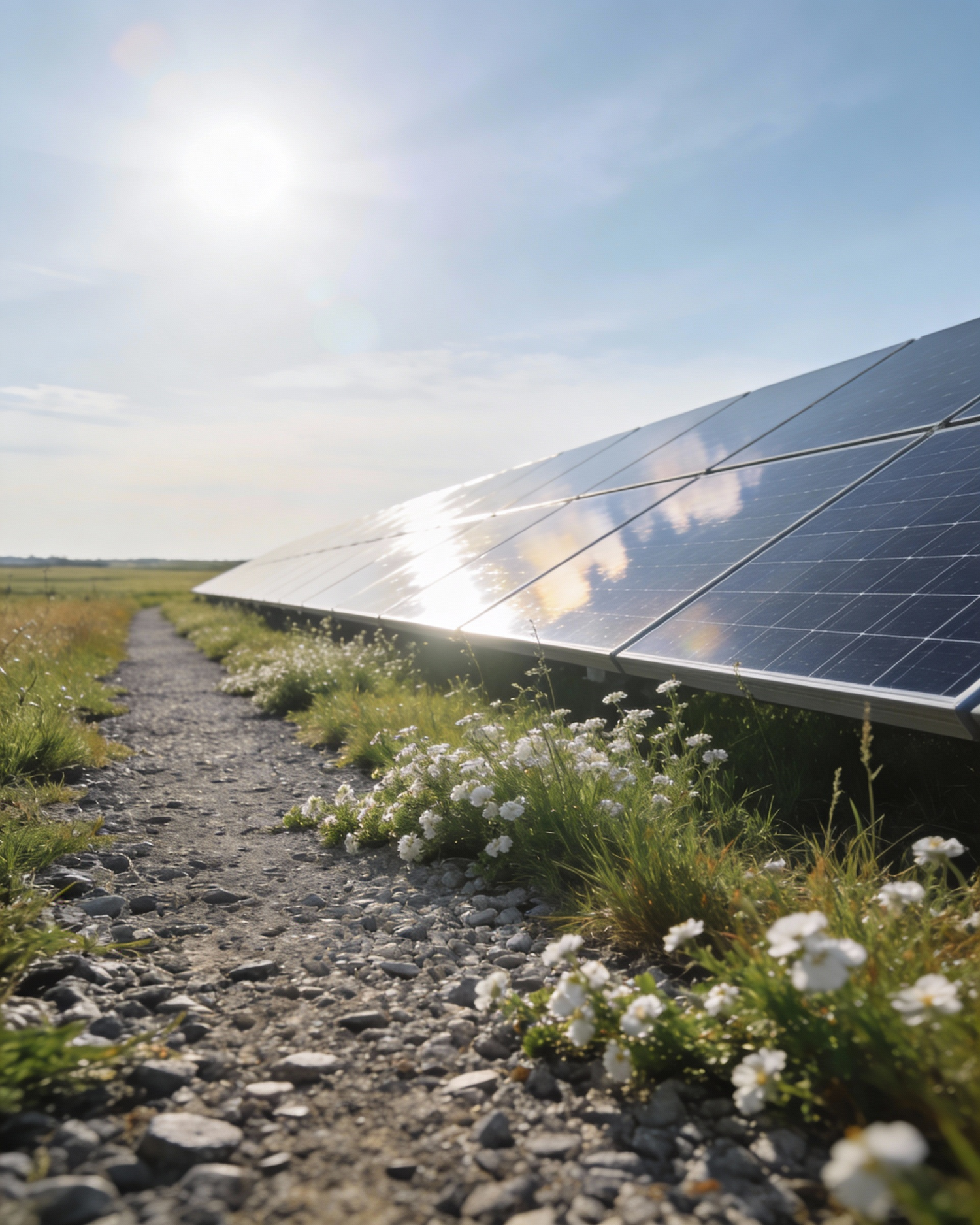 Ultra-realistic landscape photograph, low perspective along a gravel maintenance path running beside solar panels, meadow grass and tiny white flowers spilling onto the path edges, subtle sky reflection on panel surfaces (no hotspots), clean sunny day with soft haze, controlled glare with smooth highlight roll-off, 50 mm look, f/8, ISO 100, 1/800 s; circular polarizer to reduce glare—avoid rainbow banding. Negative: harsh glare, mirror reflections, prism flare, HDR, halos, over-clarity.