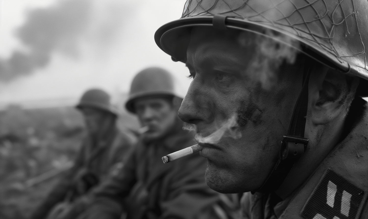 Black and white photo of soldiers smoking, with a focus on a contemplative soldier in the foreground, set in a battlefield scene.