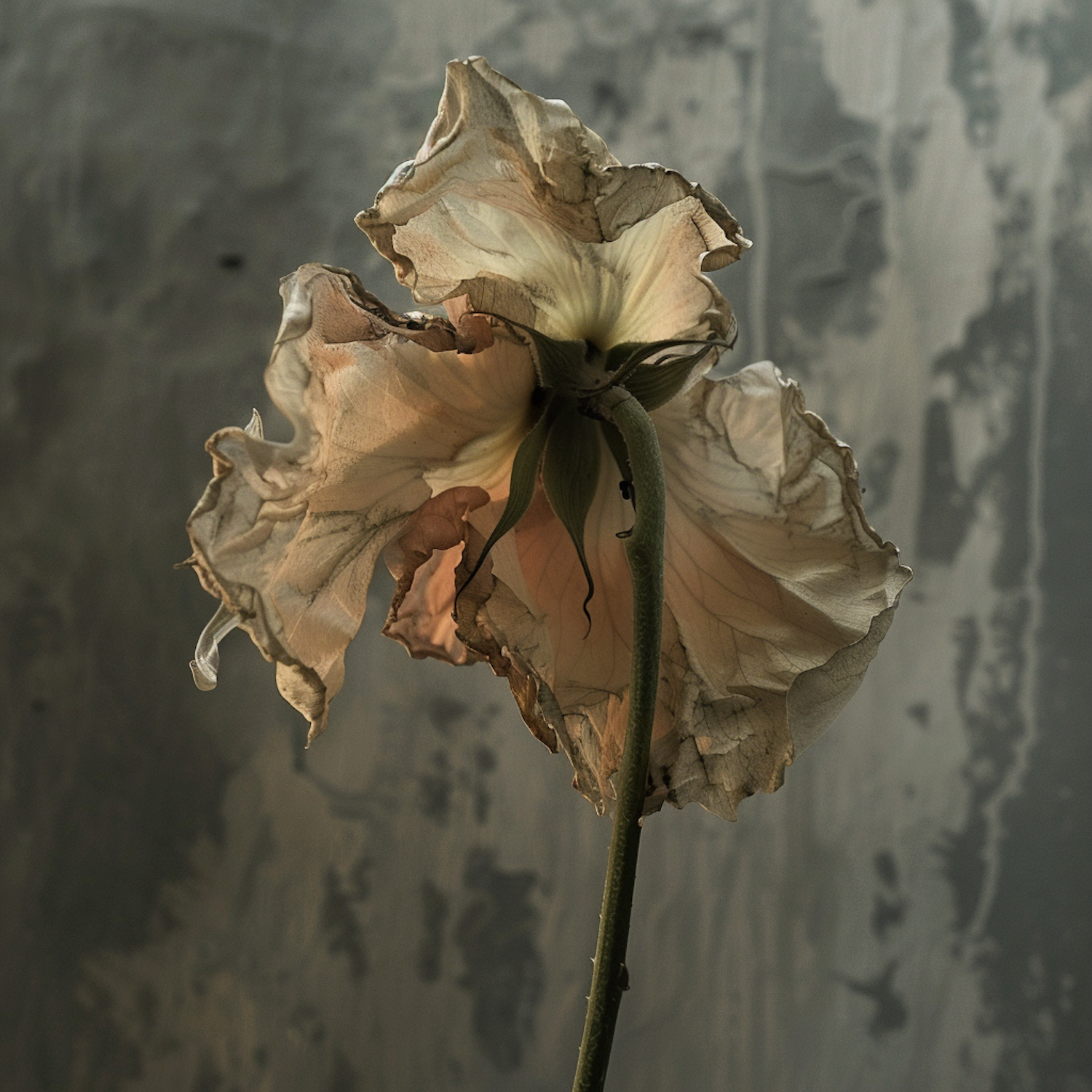 Close-up of a withered flower with crumpled petals against a textured background, highlighting its delicate and fragile beauty.